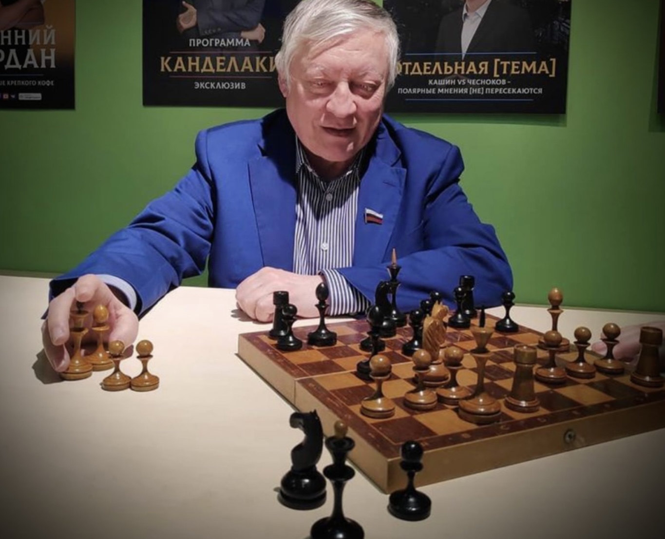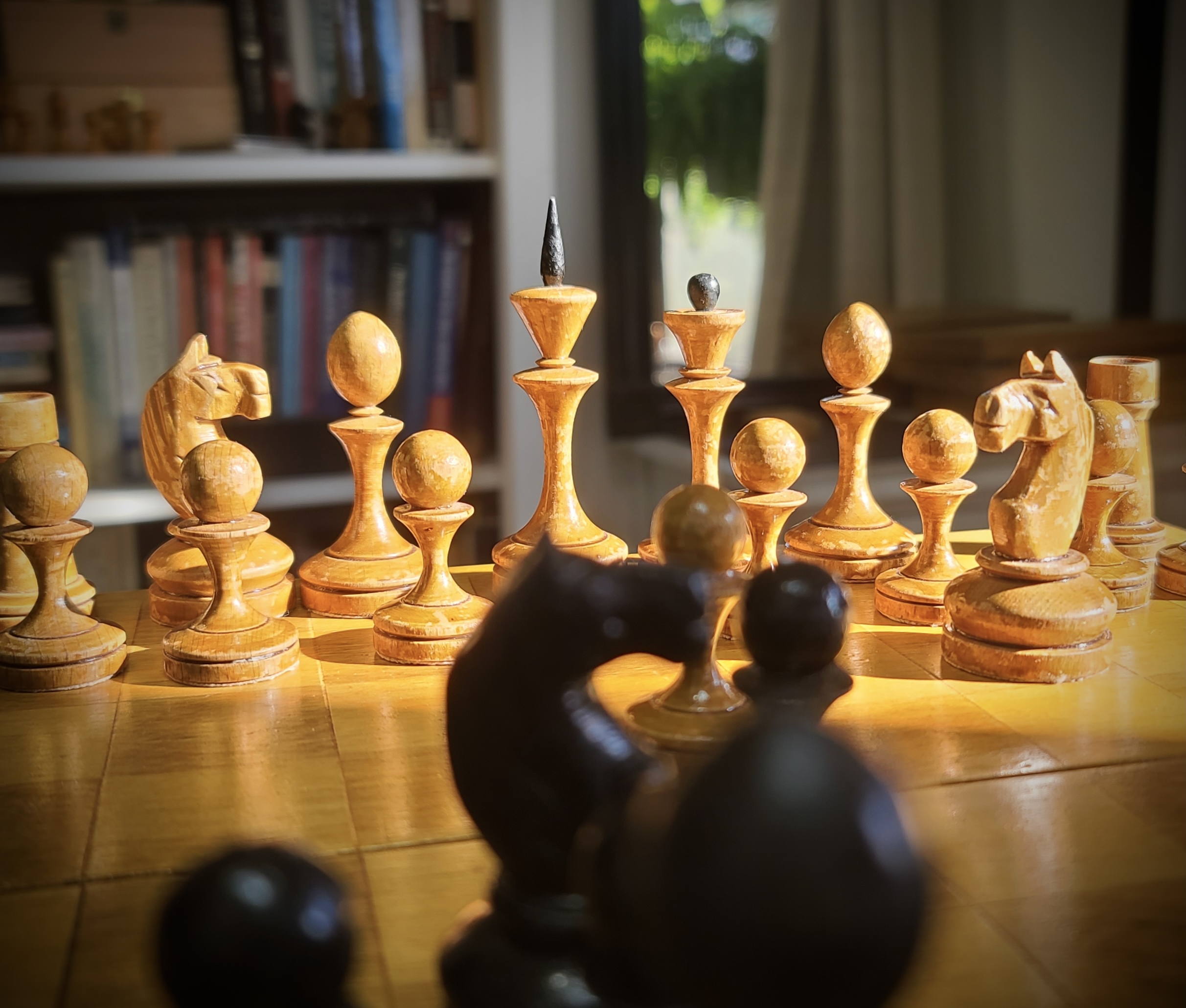 This old pattern is a popular member of the ‘Averbakh family’ of chess pieces that stand tall, lean and dignified, much like their namesake, the Soviet GM Yuri Averbakh, to whom they will be forever associated. Another legendary Soviet GM, Anatoly Karpov, also favoured these pieces, as shown in the last photograph snapped during a 2020 podcast in Moscow.