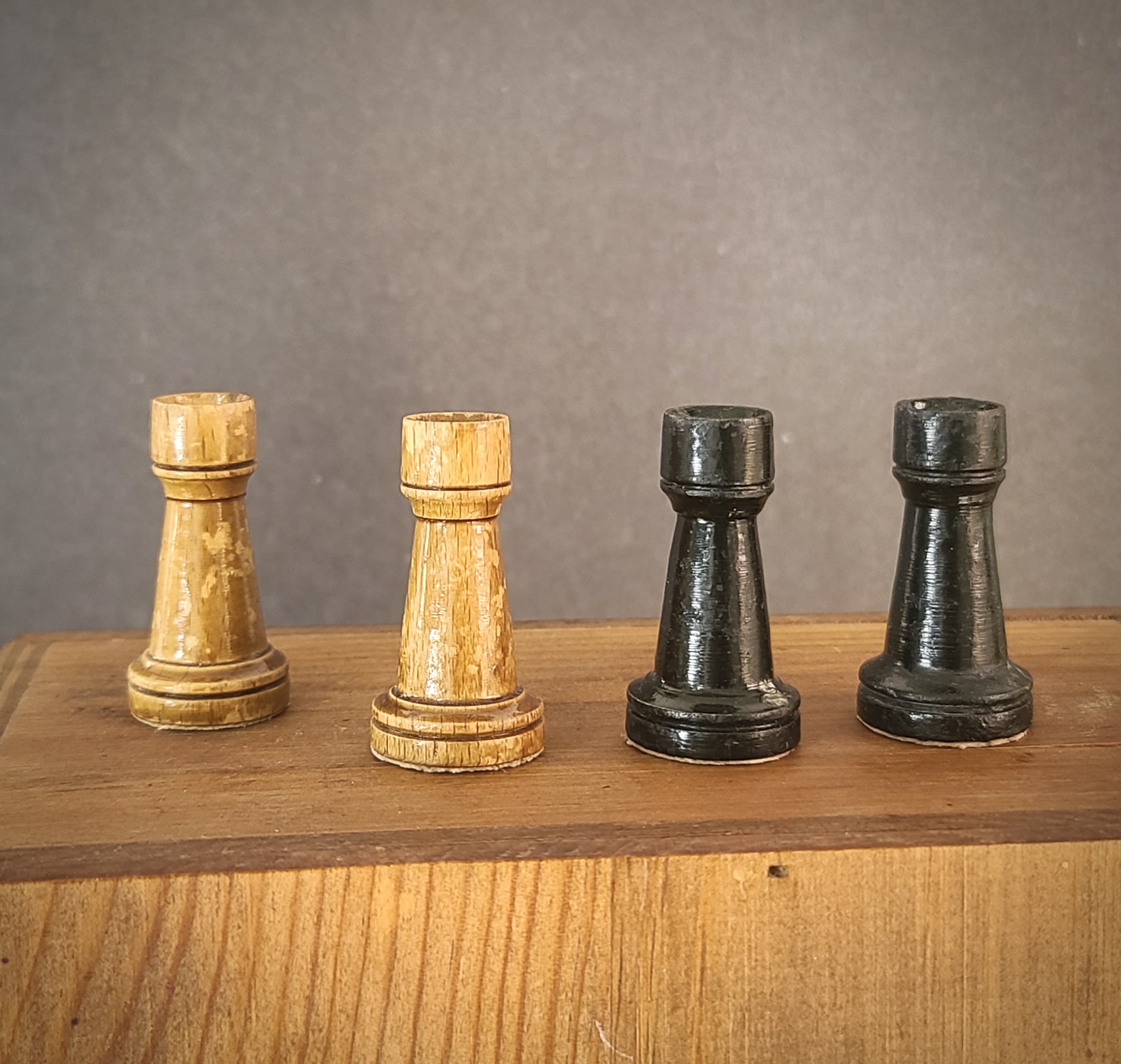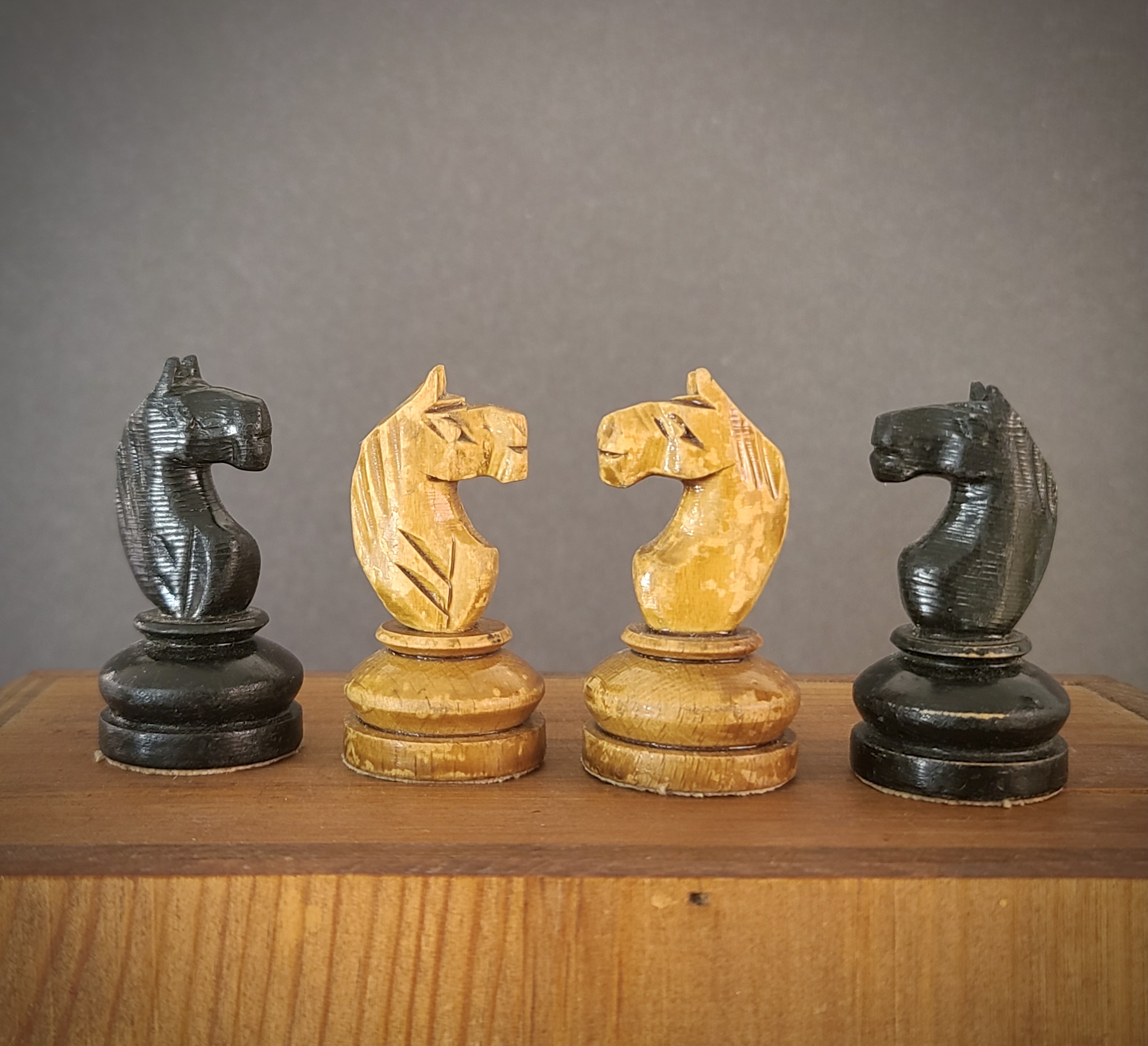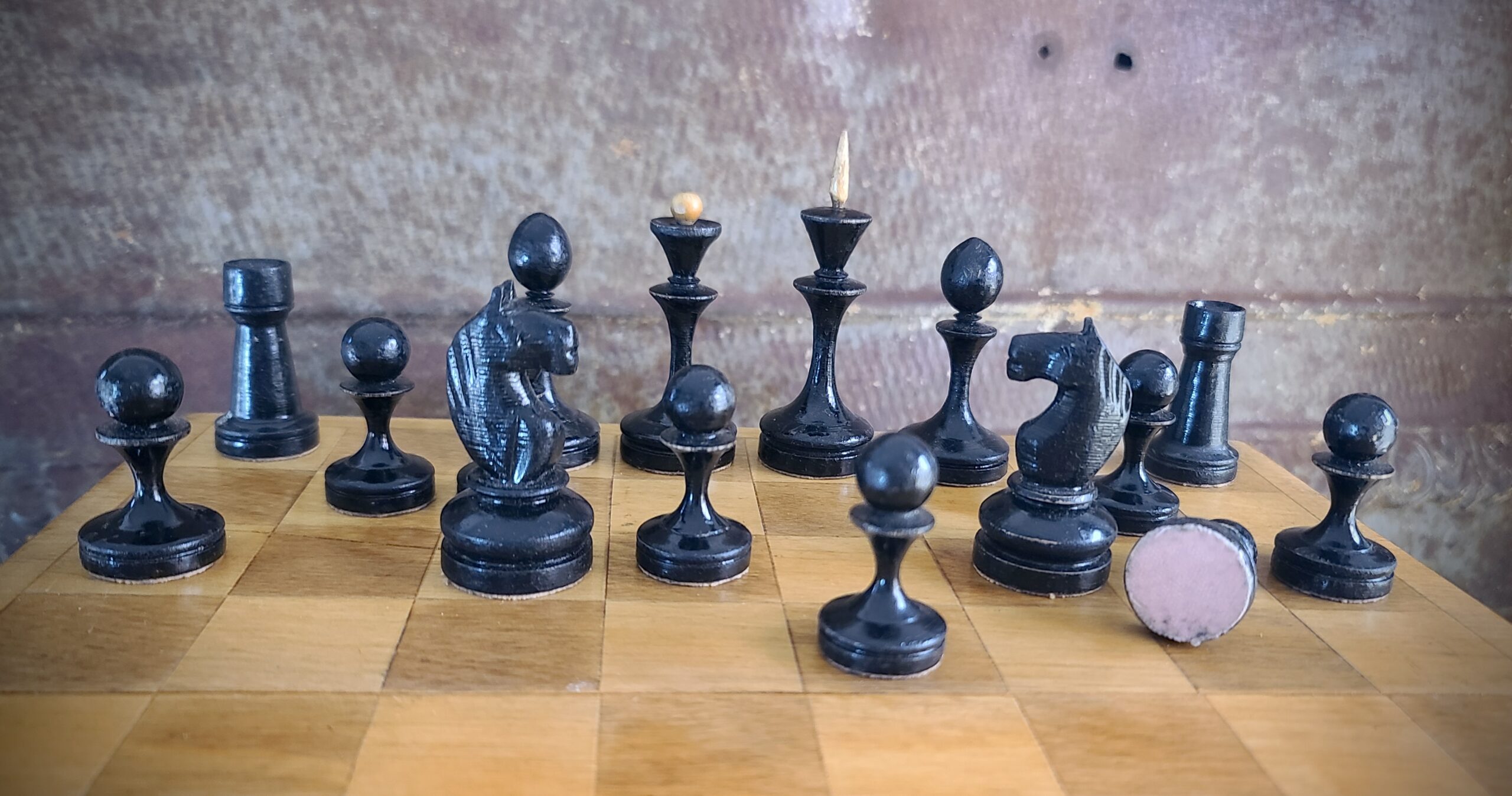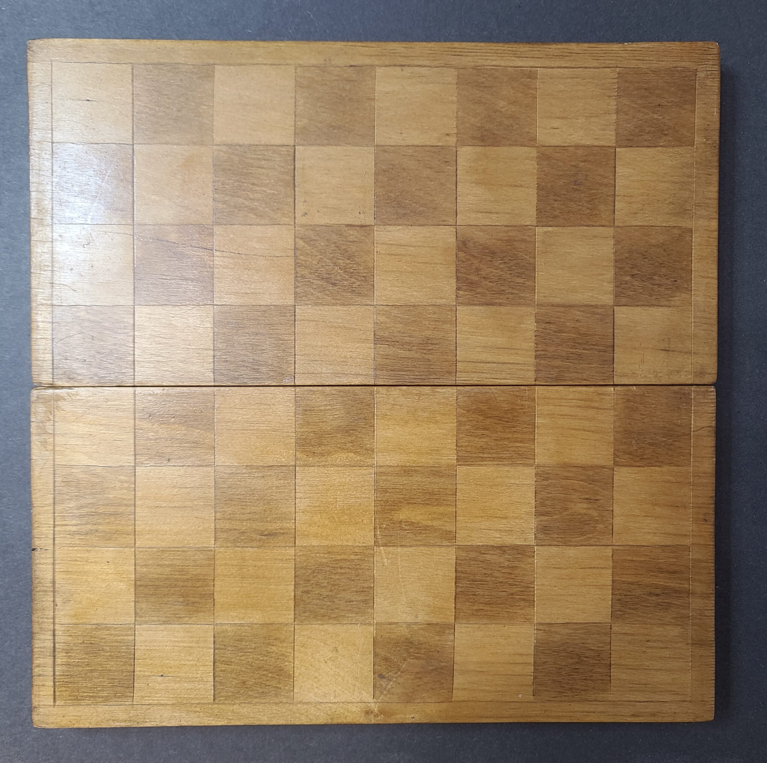 Champions of the Dorm (‘Stabulum Victores’); 32 vintage chess pieces with original folding board (stamped), Soviet (Artel MYUD, Khalturin), medium-sized, caramel vs. black, birch wood, unweighted, partially restored, original board dated 1956.