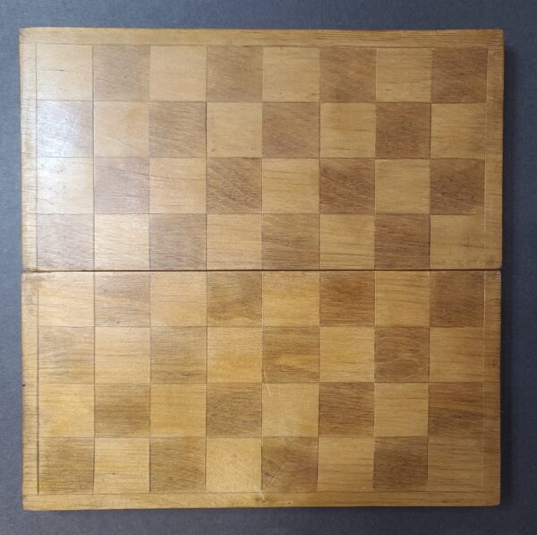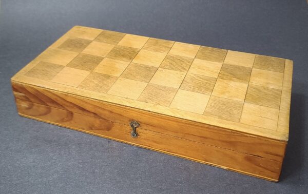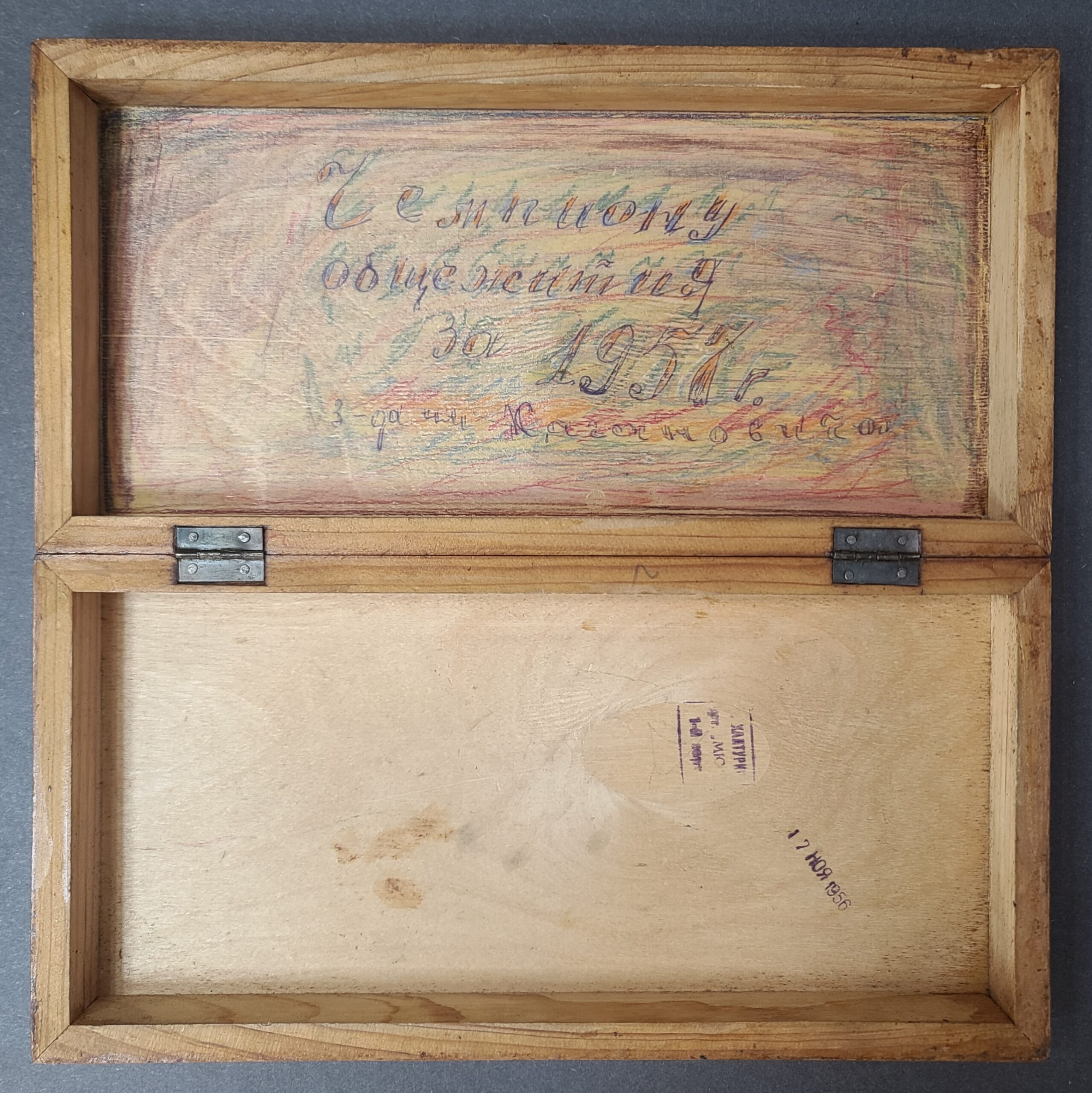 Squares: 3.5cm. The board is in great condition with original hinges and single clasp. On the inside is an inscription in blue ink and coloured crayon; “to the champion of the plant hostel named in honour of Kaganovich, 1957”. The stamp indicates the set was manufactured by Artel MYUD (International Youth Day), Khalturin, Kharkiv in 1956.