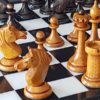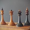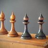 The iconic ‘elbow-shaped’ knights (a slightly earlier form of the more popular “Tal” design pictured in the link below) have a rugged simplicity about them and are very comfortable in hand – even more so with this set, which has been lightly weighted lending them added substance on the field.* The simple tear-drop mitre of the bishop can only be inspired by Moscow’s Saint Basil’s Cathedral and its “towering domes shaped like the flames of a bonfire rising into the sky” (A. Ivanov, The Tsars p.100). A vivid analogy I bore in mind when layering the fiery amber hues over the lighter side of this set. Which, if you follow The Chess Schach on social media, would know were inspired by the white knights. When they came to me the bases of the knights and the rest of the white pieces in general were lighter in colour and had a somewhat less attractive patina. The decision was therefore made to strip down the set and colour-match them to the finish of the stunning white/amber knights – a decision, that in my humble opinion, has resulted in a stunning set all ’round! And a quite historic one to boot.