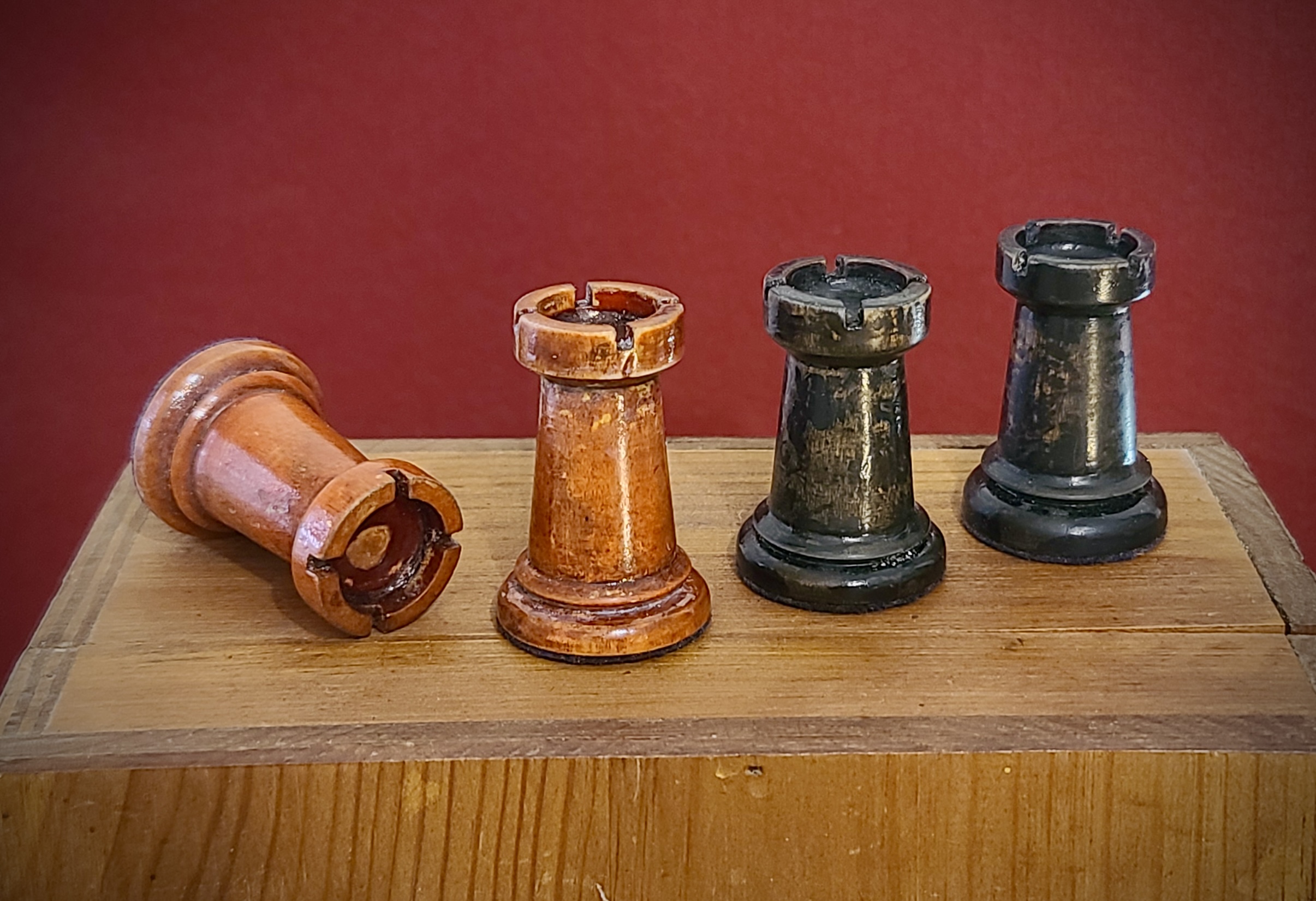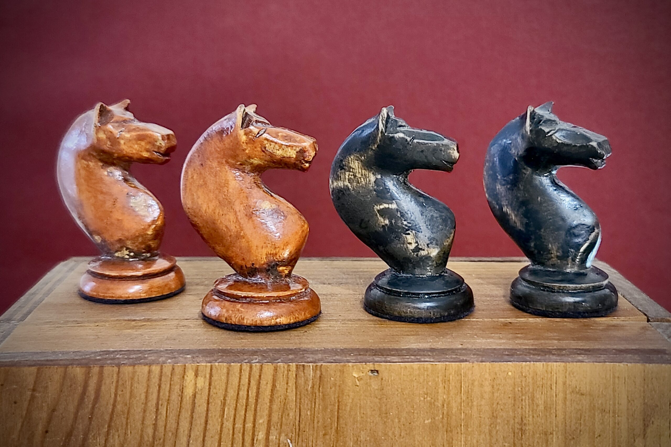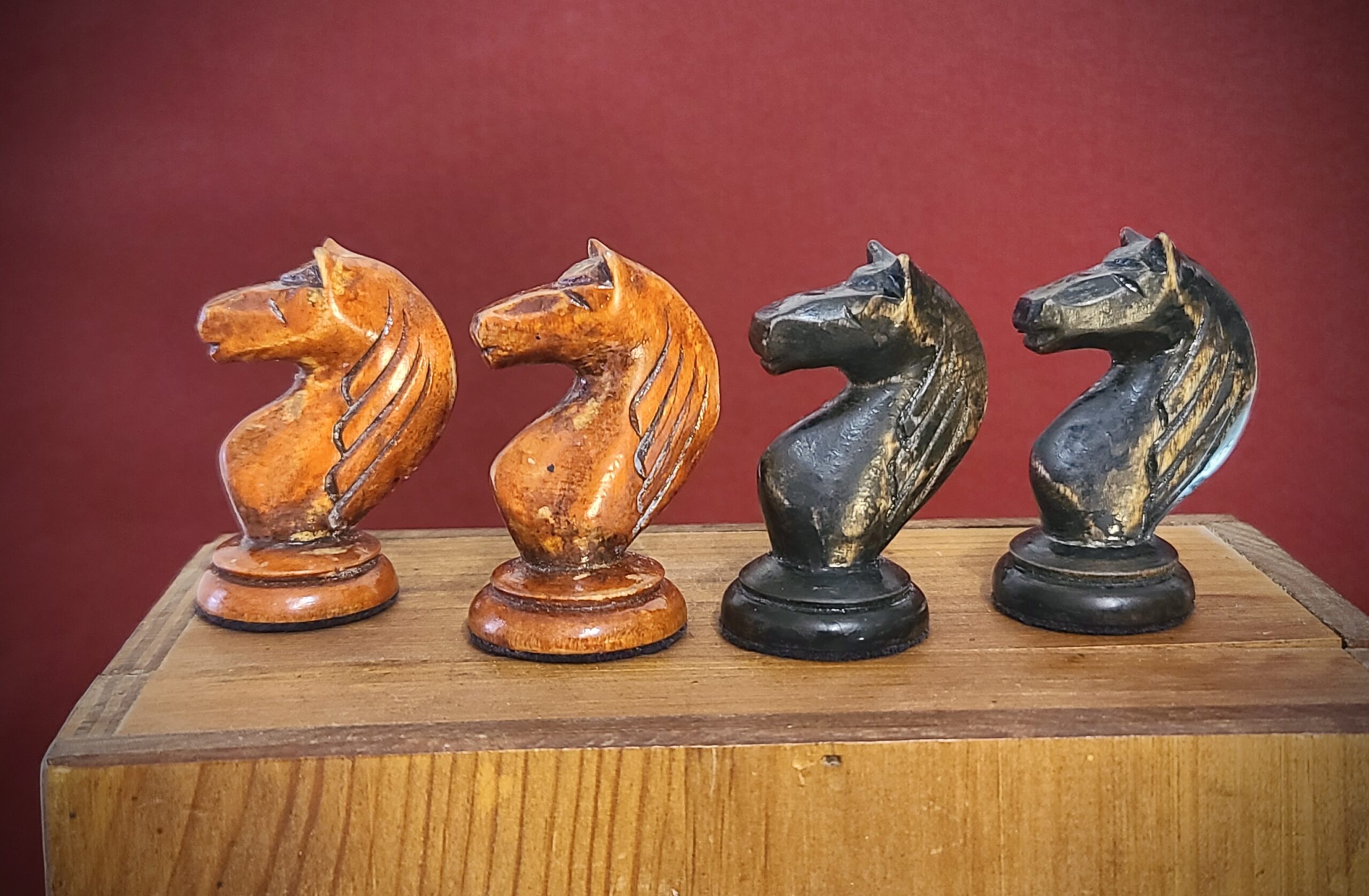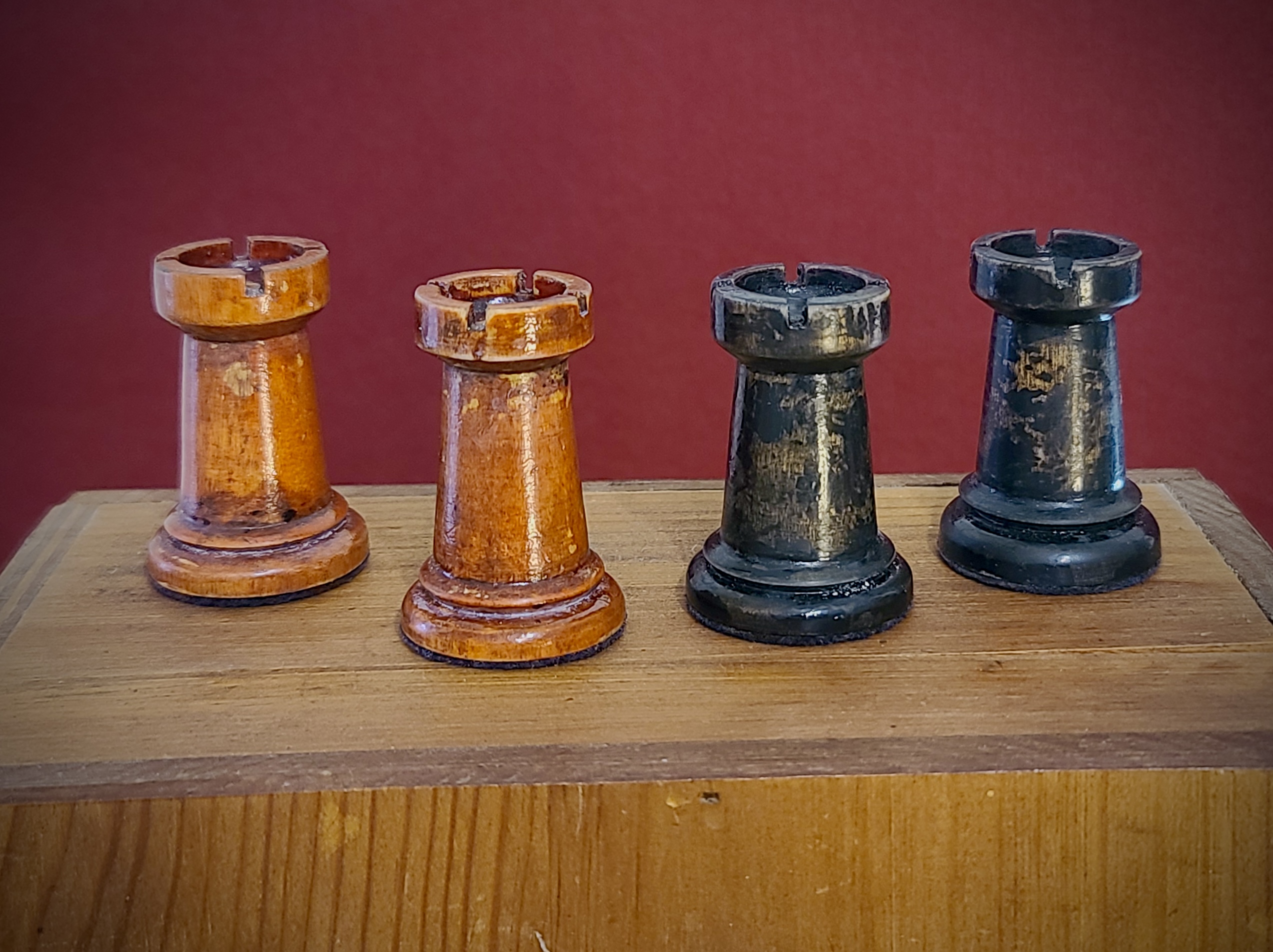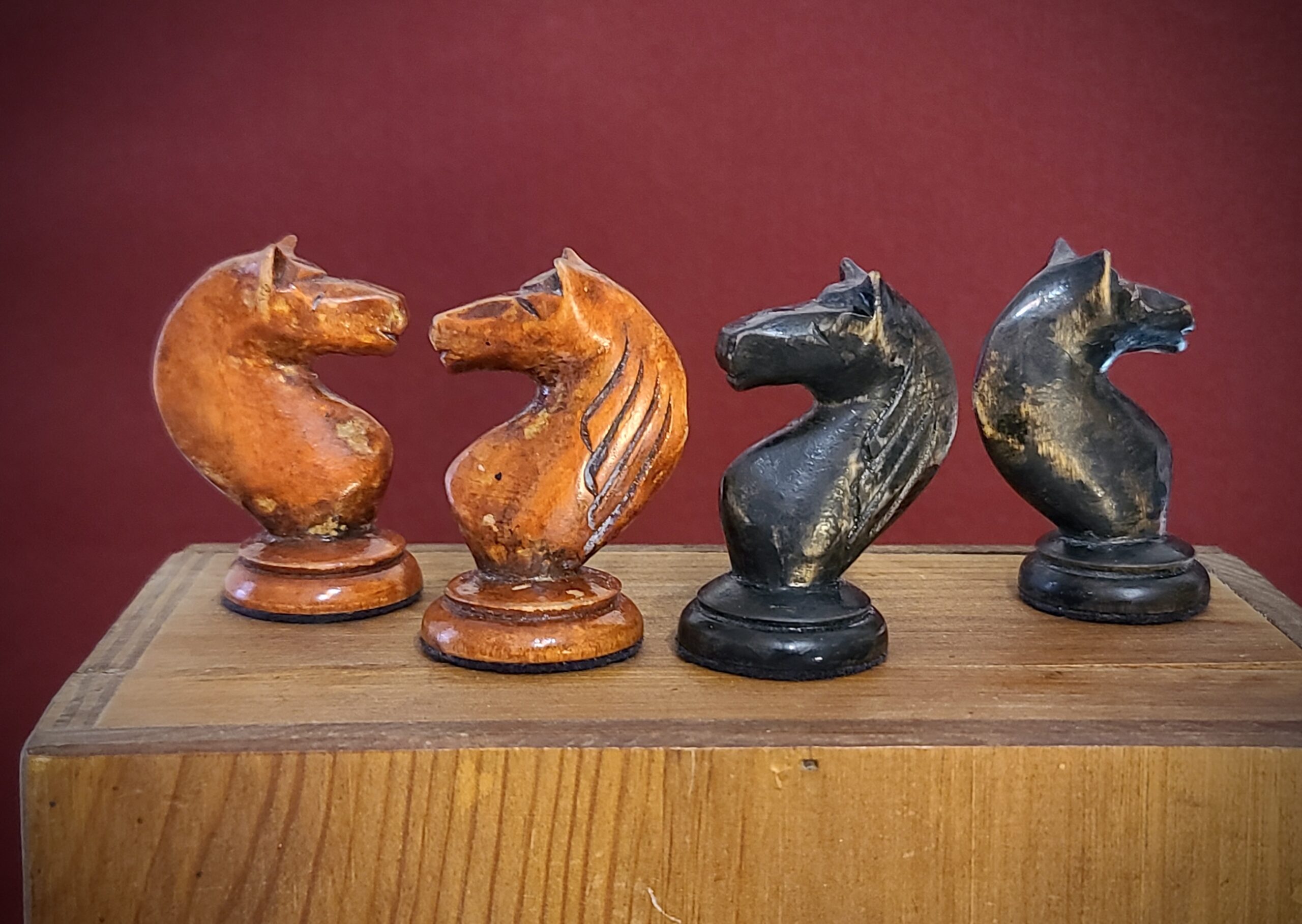 The set has been weighted, as most collectors find the pieces a little too light for their liking, as do I. Disc weights were used for the knights and once you handle them, honestly, you’ll never want to play with an unweighted Mordovian set again! The board is not native to the set but of the same era. It has been darkened and antiqued. The word ‘mor’ means dark, or murky, hence my playful moniker for the set – The Field of Shadows – as opposed to Mordor; The Land of Darkness… 😉
