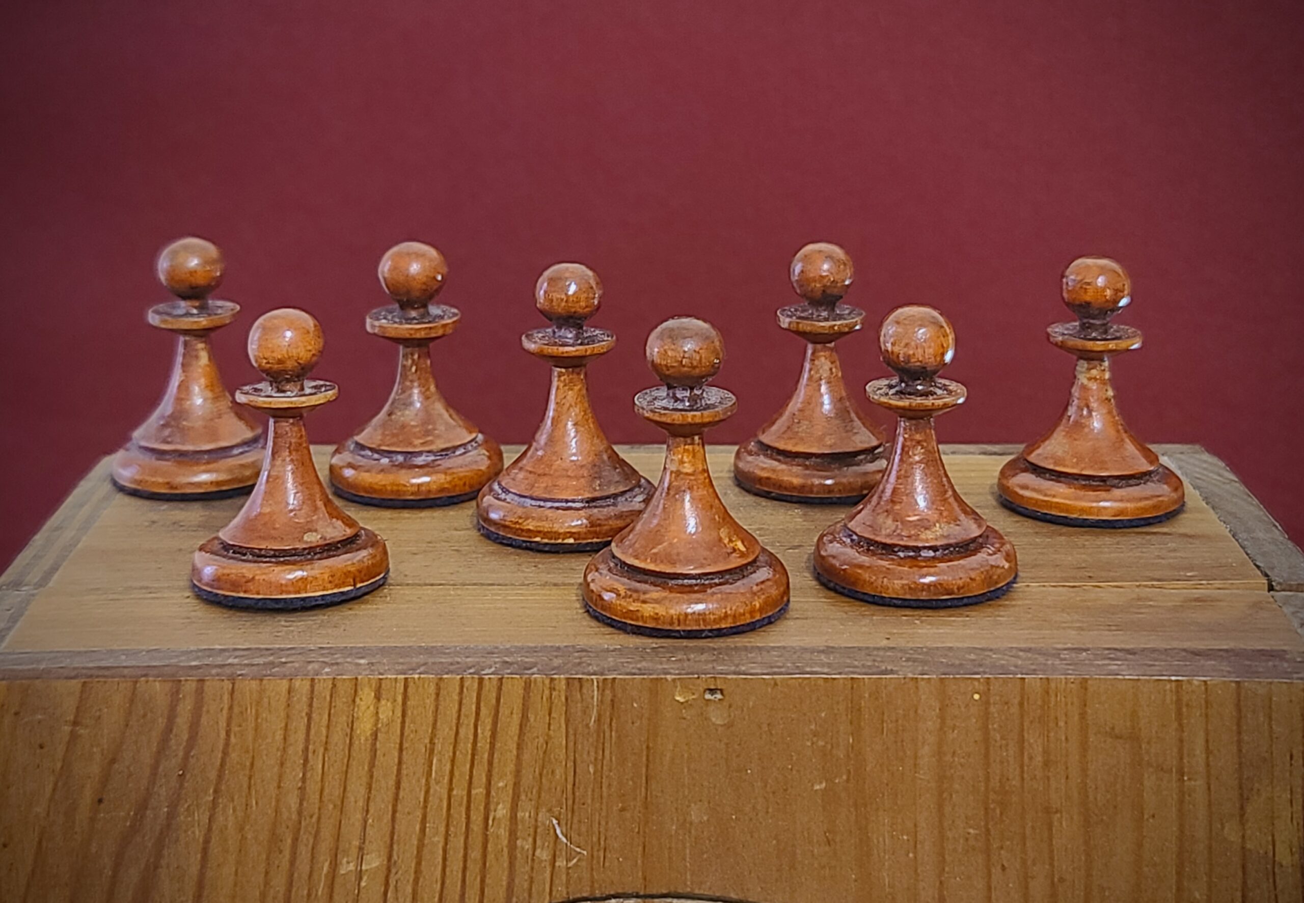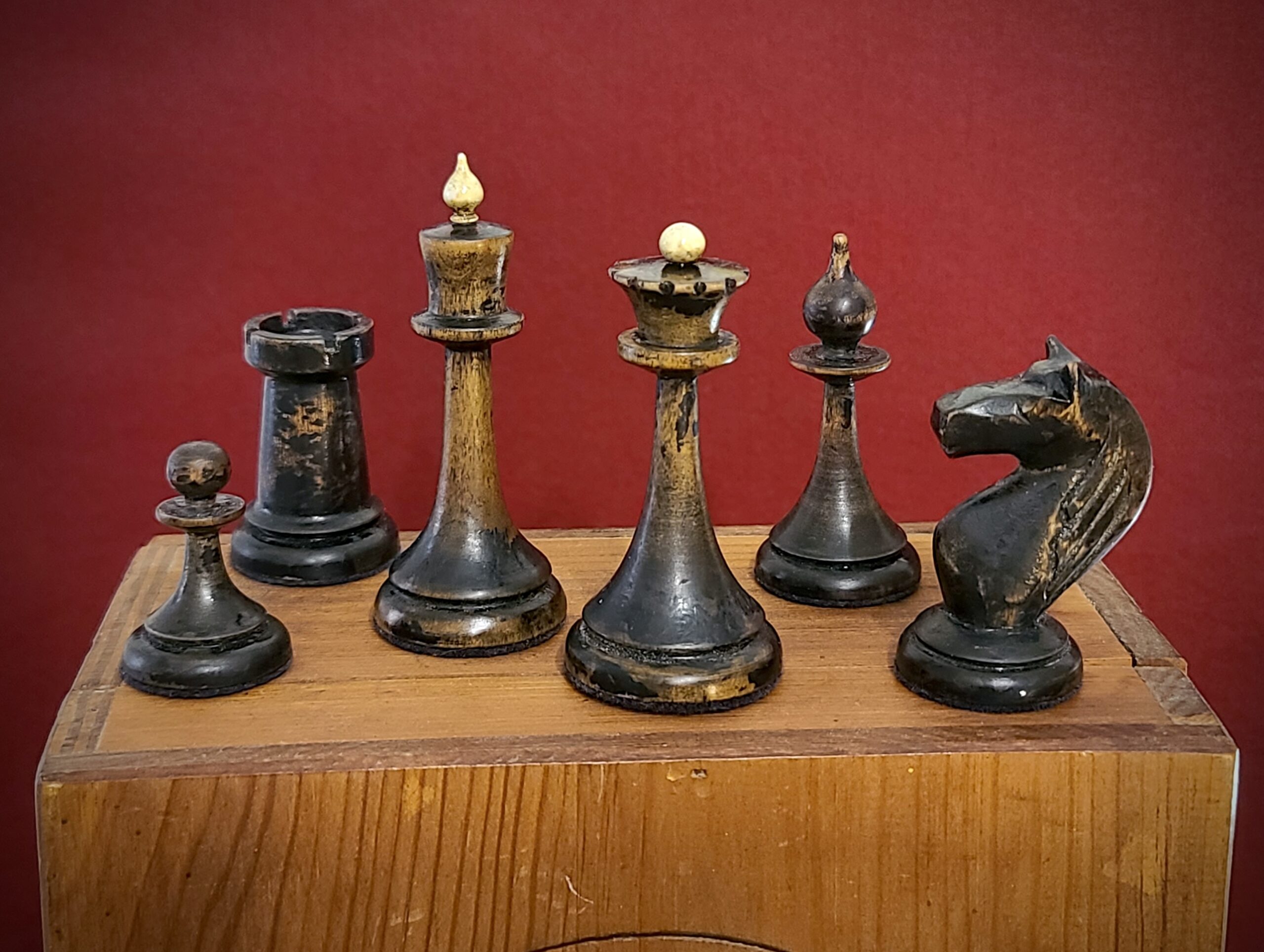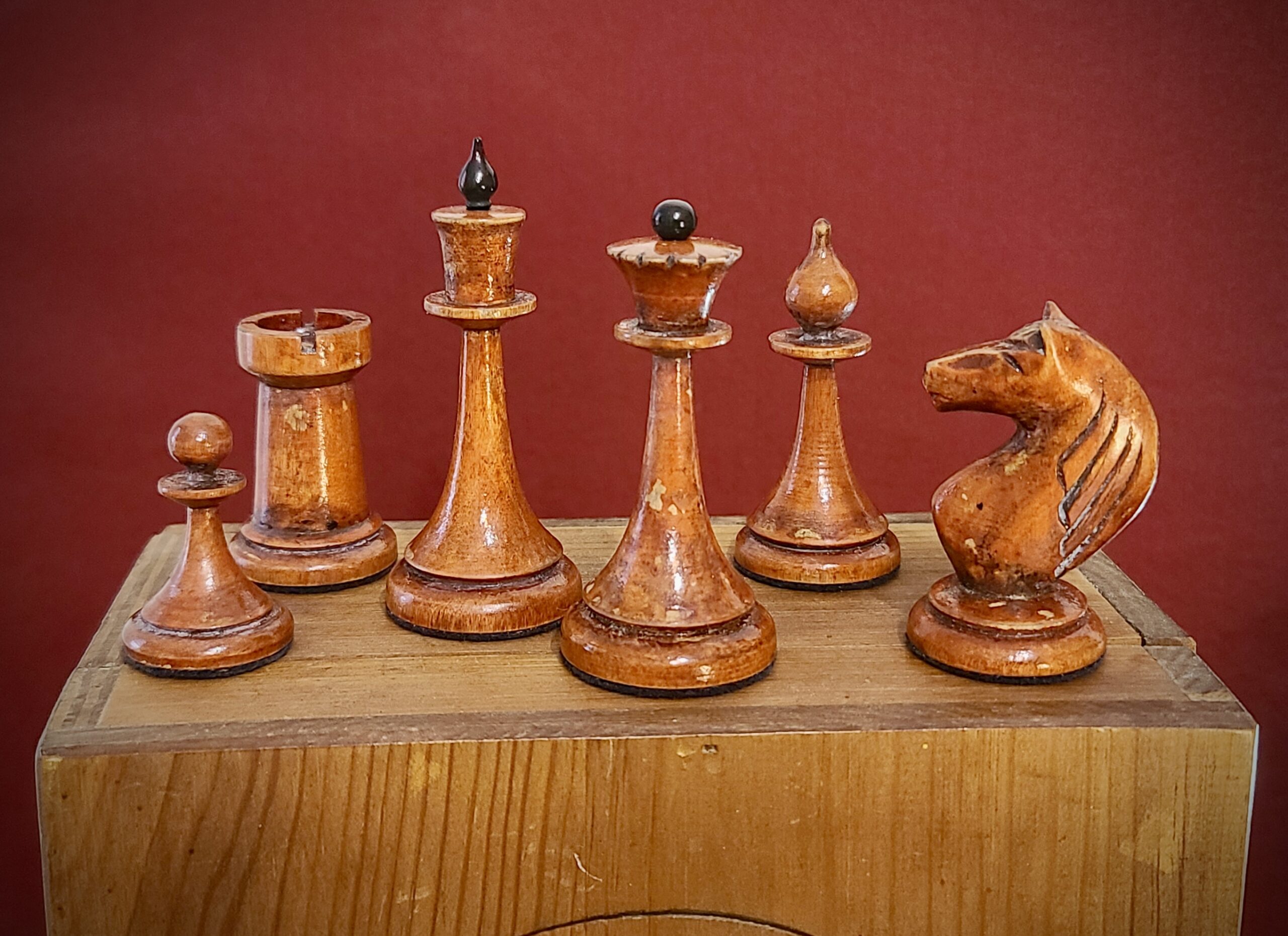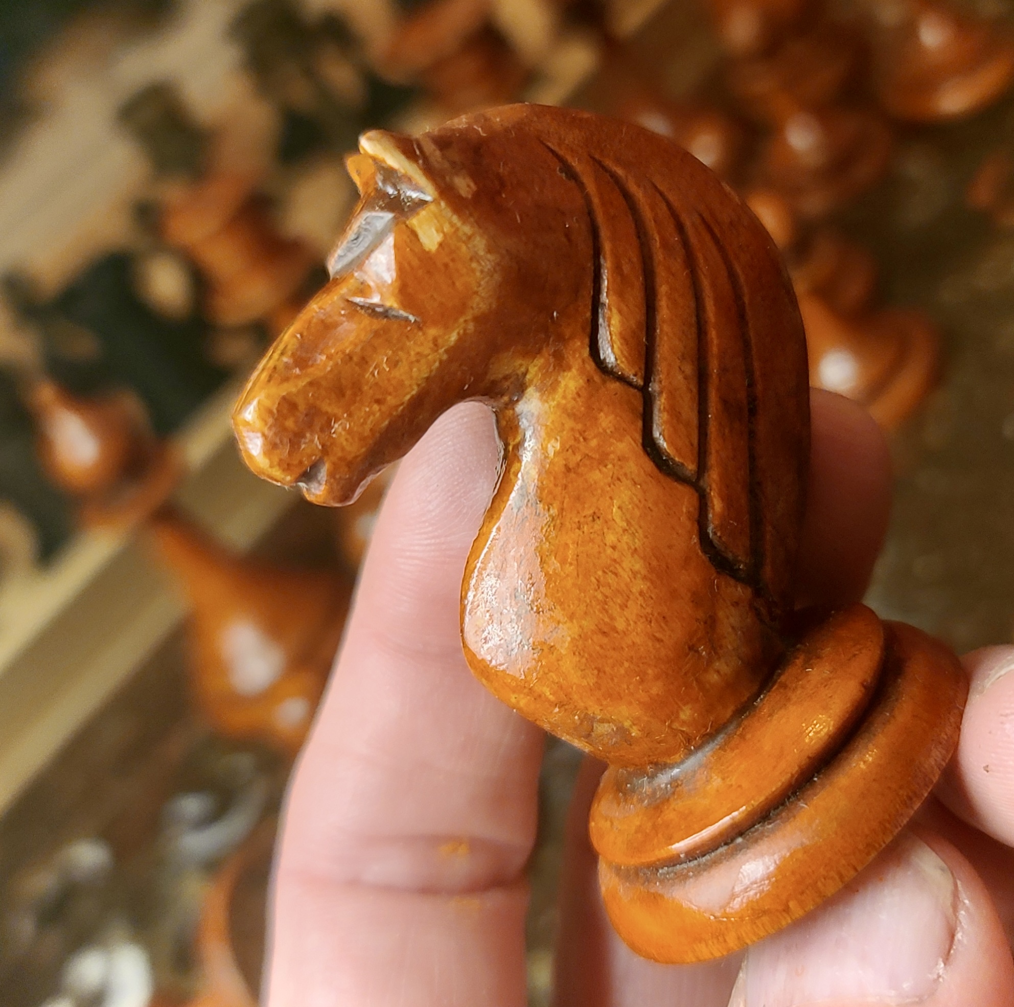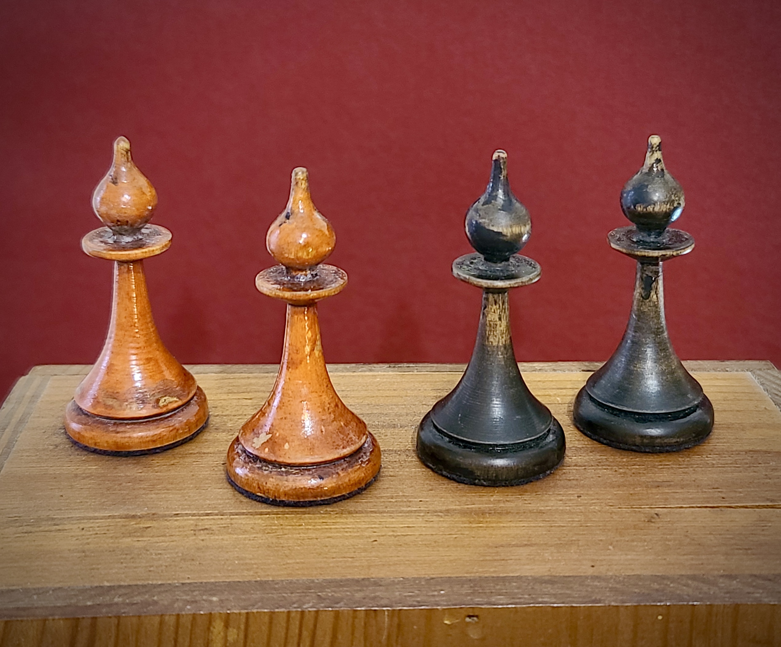 The set has been weighted, as most collectors find the pieces a little too light for their liking, as do I. Disc weights were used for the knights and once you handle them, honestly, you’ll never want to play with an unweighted Mordovian set again! The board is not native to the set but of the same era. It has been darkened and antiqued. The word ‘mor’ means dark, or murky, hence my playful moniker for the set – The Field of Shadows – as opposed to Mordor; The Land of Darkness… 😉