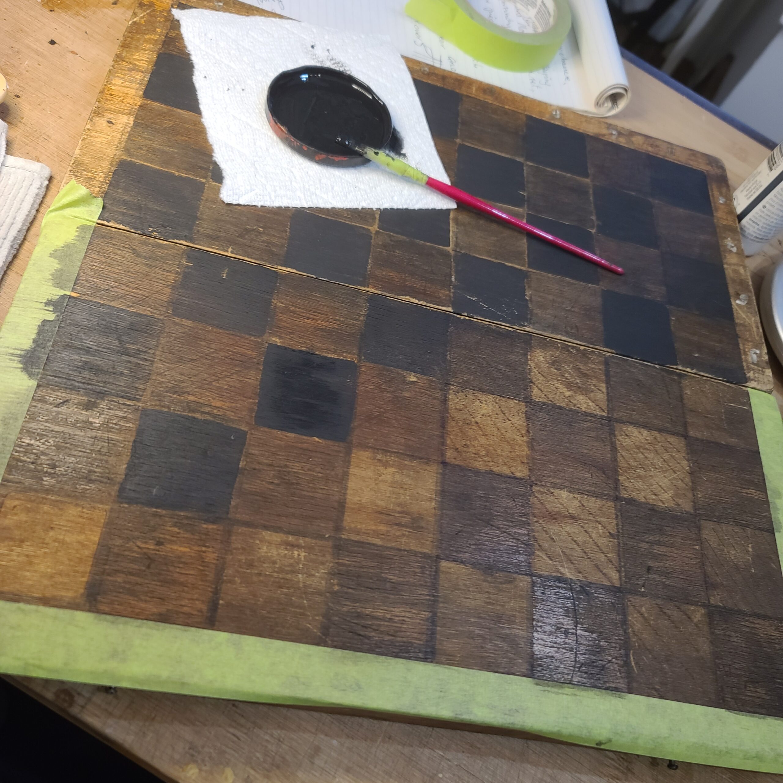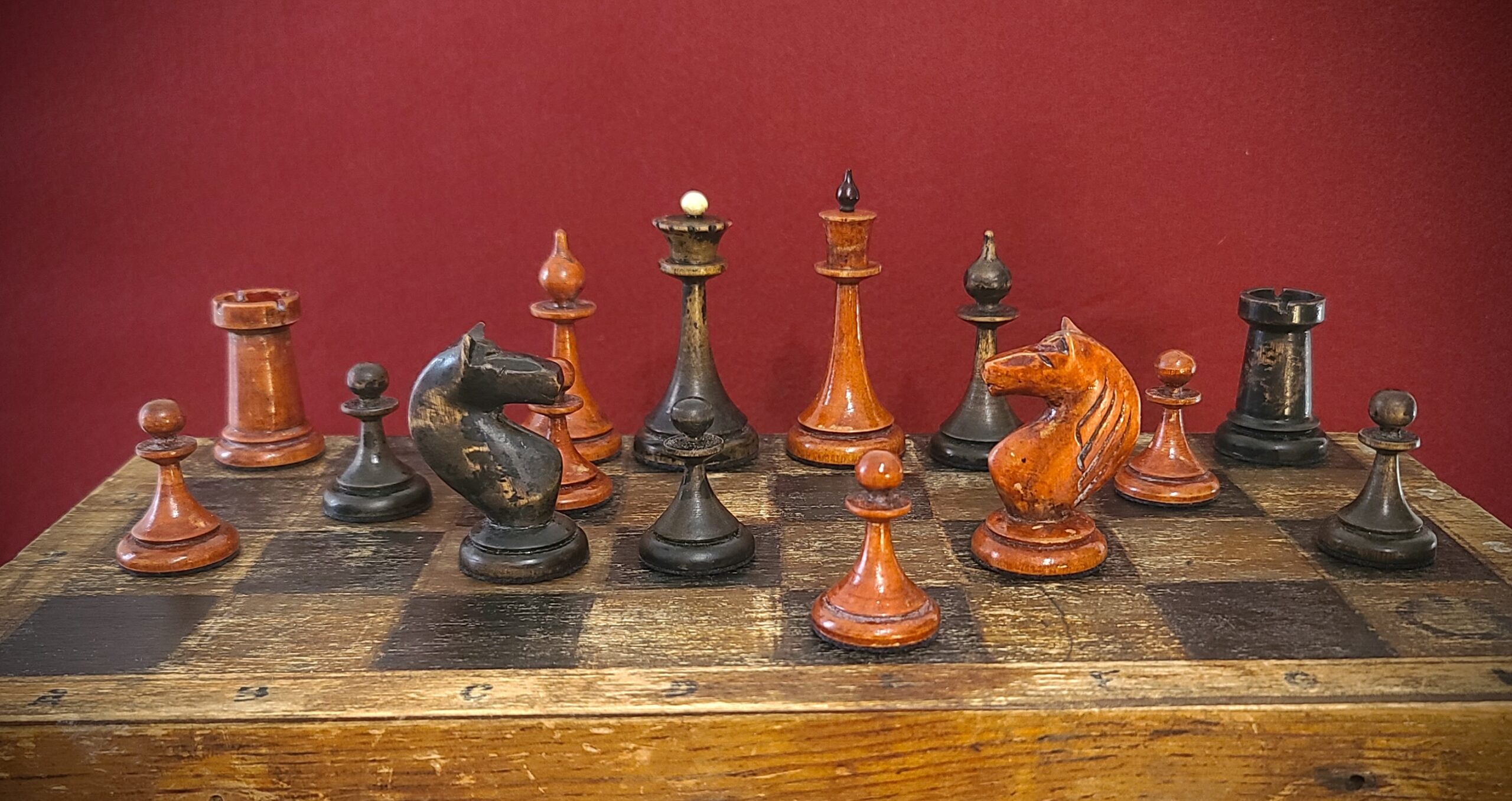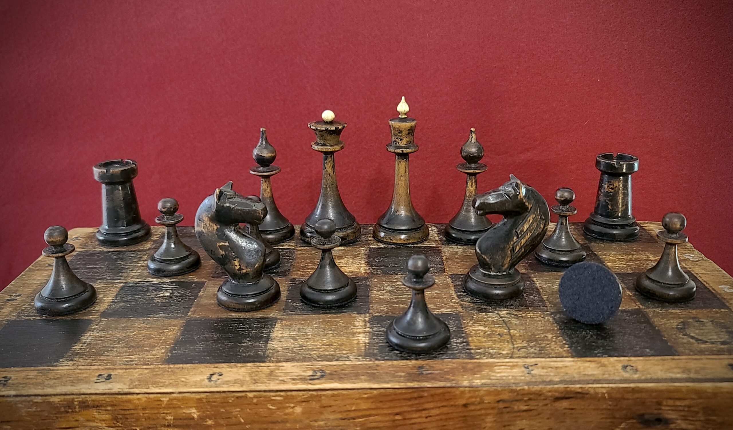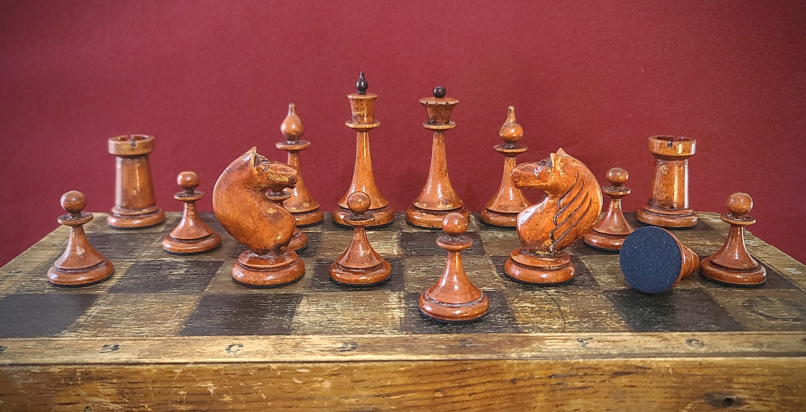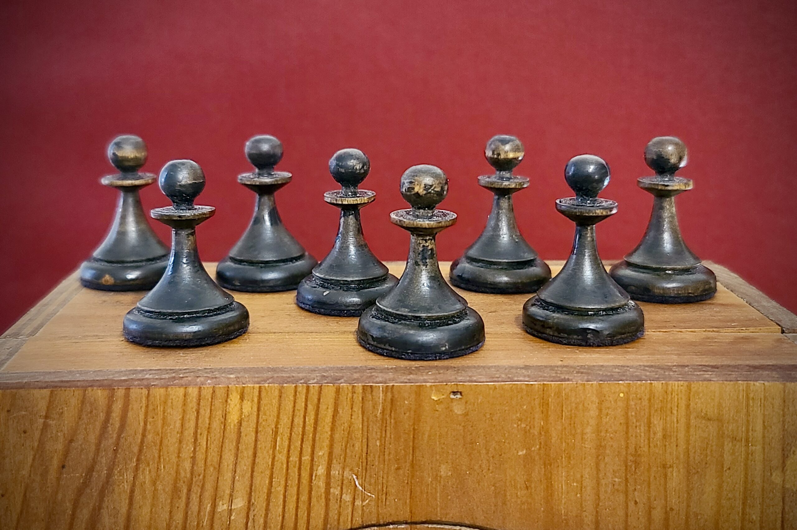 The set has been weighted, as most collectors find the pieces a little too light for their liking, as do I. Disc weights were used for the knights and once you handle them, honestly, you’ll never want to play with an unweighted Mordovian set again! The board is not native to the set but of the same era. It has been darkened and antiqued. The word ‘mor’ means dark, or murky, hence my playful moniker for the set – The Field of Shadows – as opposed to Mordor; The Land of Darkness… 😉