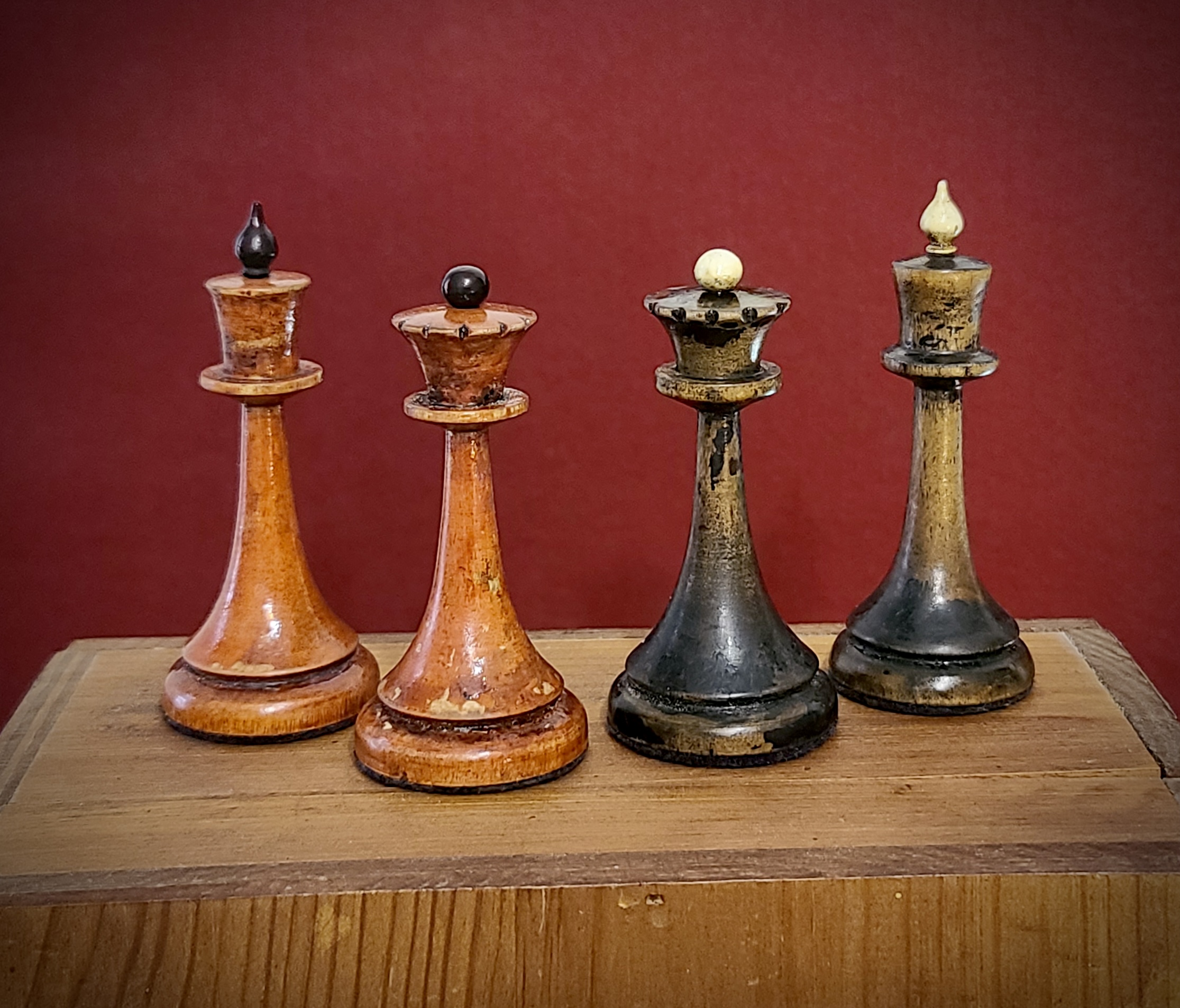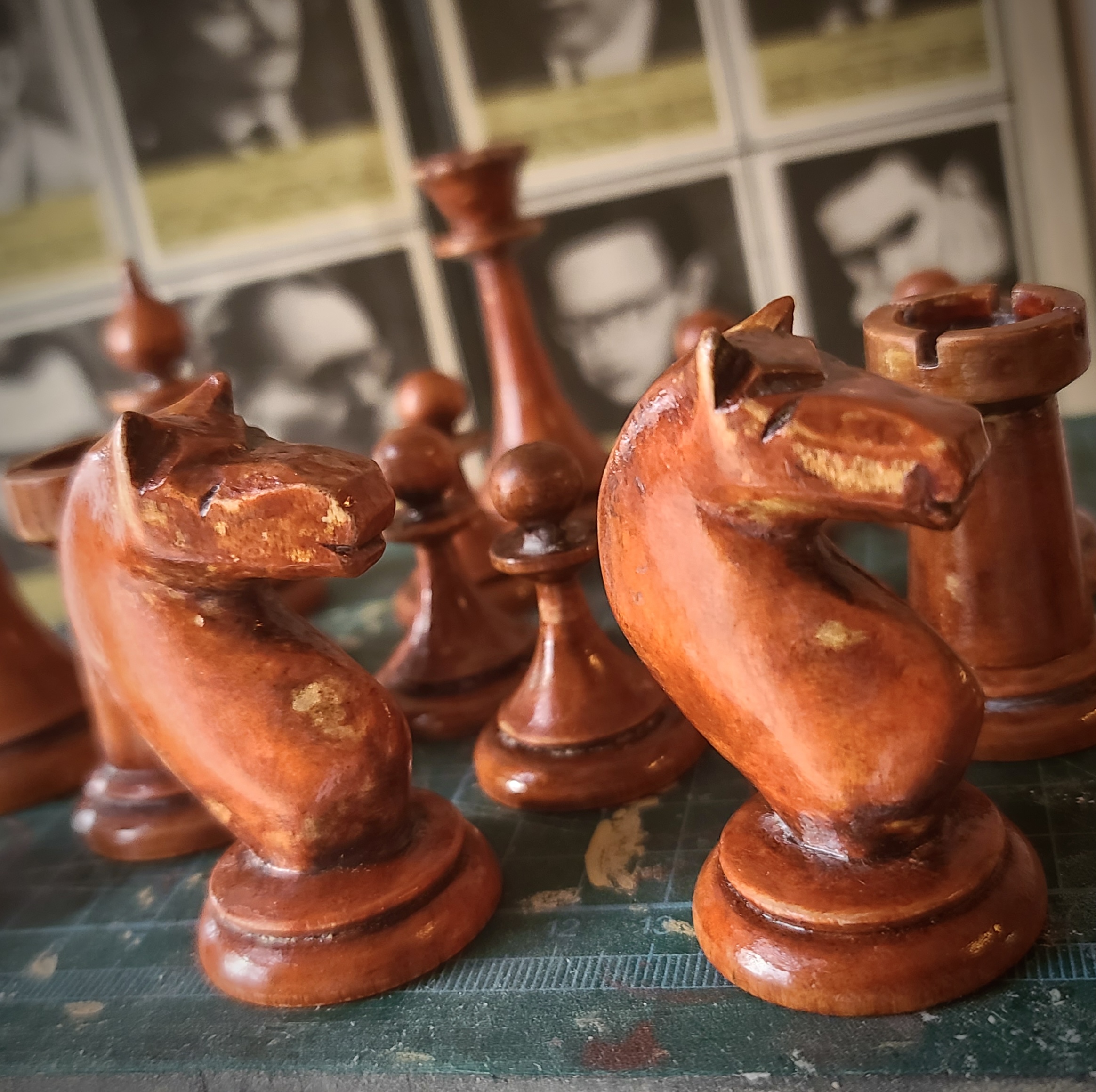 The wooden finials of the kings are my own concept mirroring the signifiers of the bishops, simply reduced to one-third of the size. The opposing colours are traditional with Soviet sets and the colour scheme is based on other extant sets of this pattern.