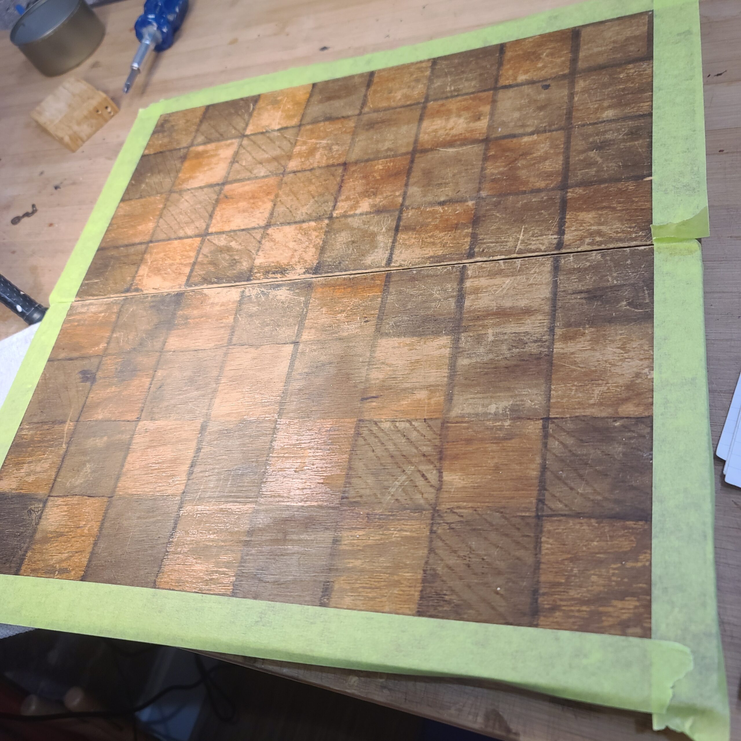 Field of Shadows (Mordor); 32 vintage chess pieces with antiqued board, wood, Soviet, fiery orange vs. black, weighted, artistically restored, c.1950-1955