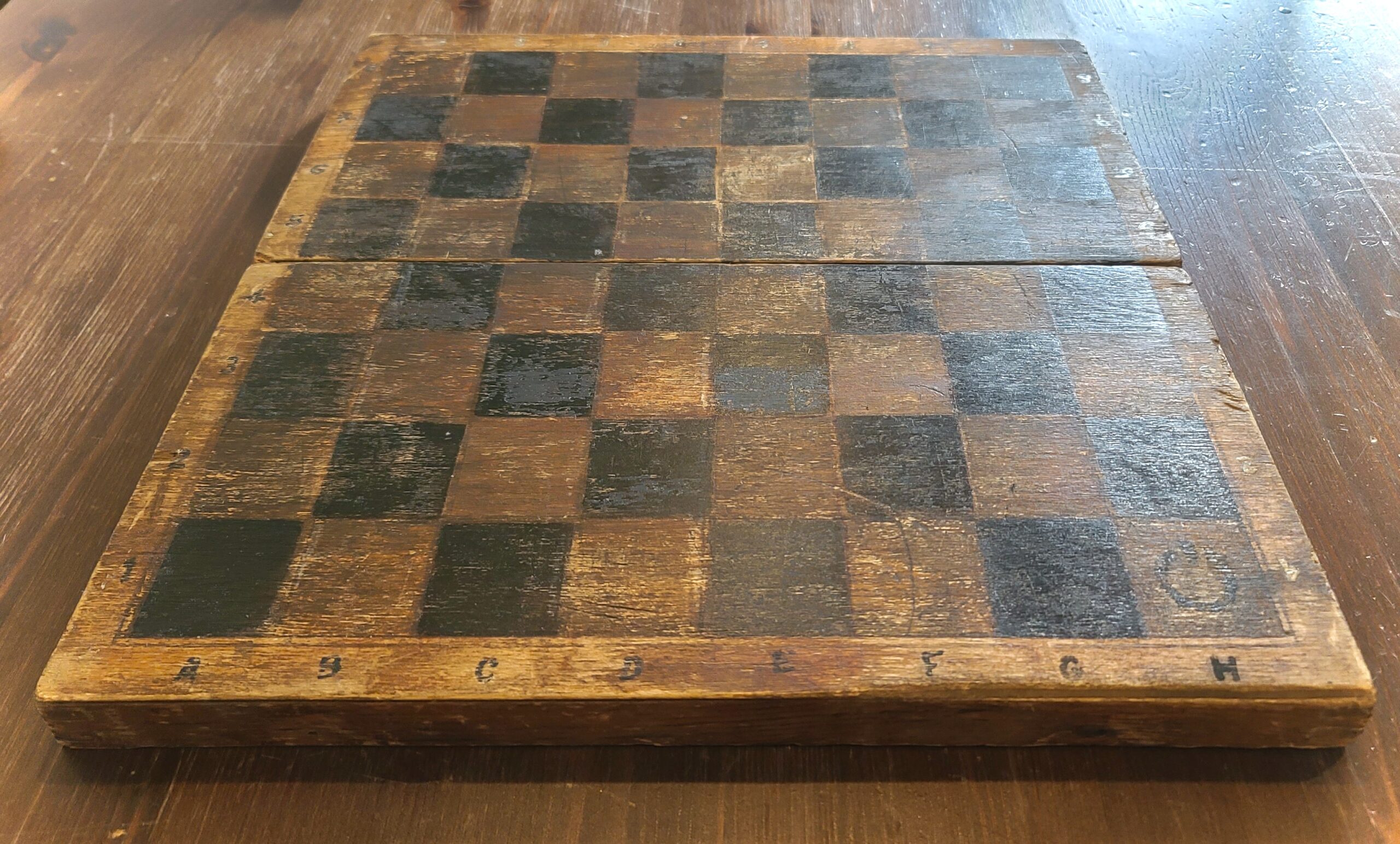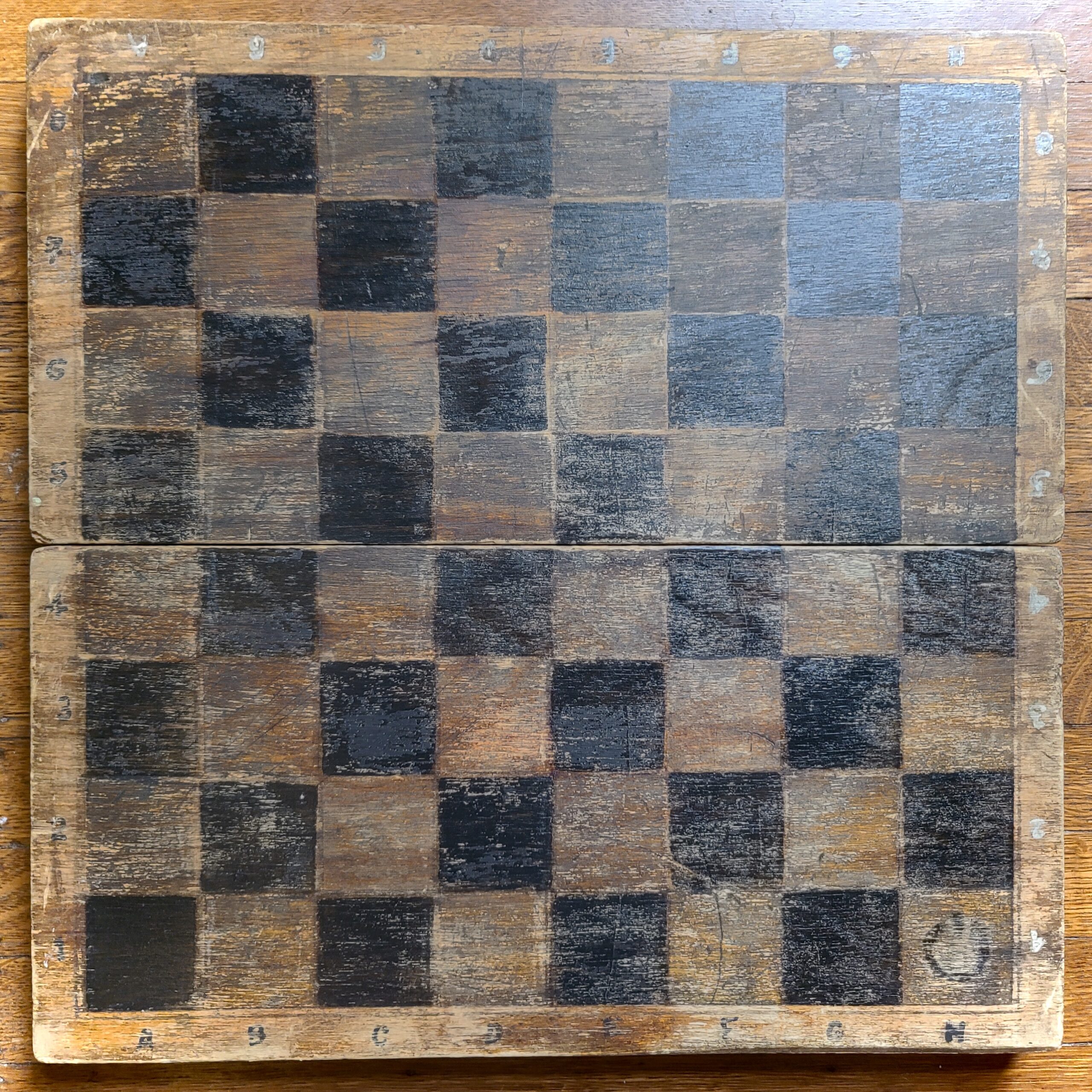 The accompanying folding board is also signed and dated by the artist. The standard notion was added by the previous owner, probably during the 1970s (it was very worn in places) when FIDE abandoned the Descriptive Notation of yesteryear. The worn areas have been restored and antiqued. The ‘Power’ signature occupies the h1 square.