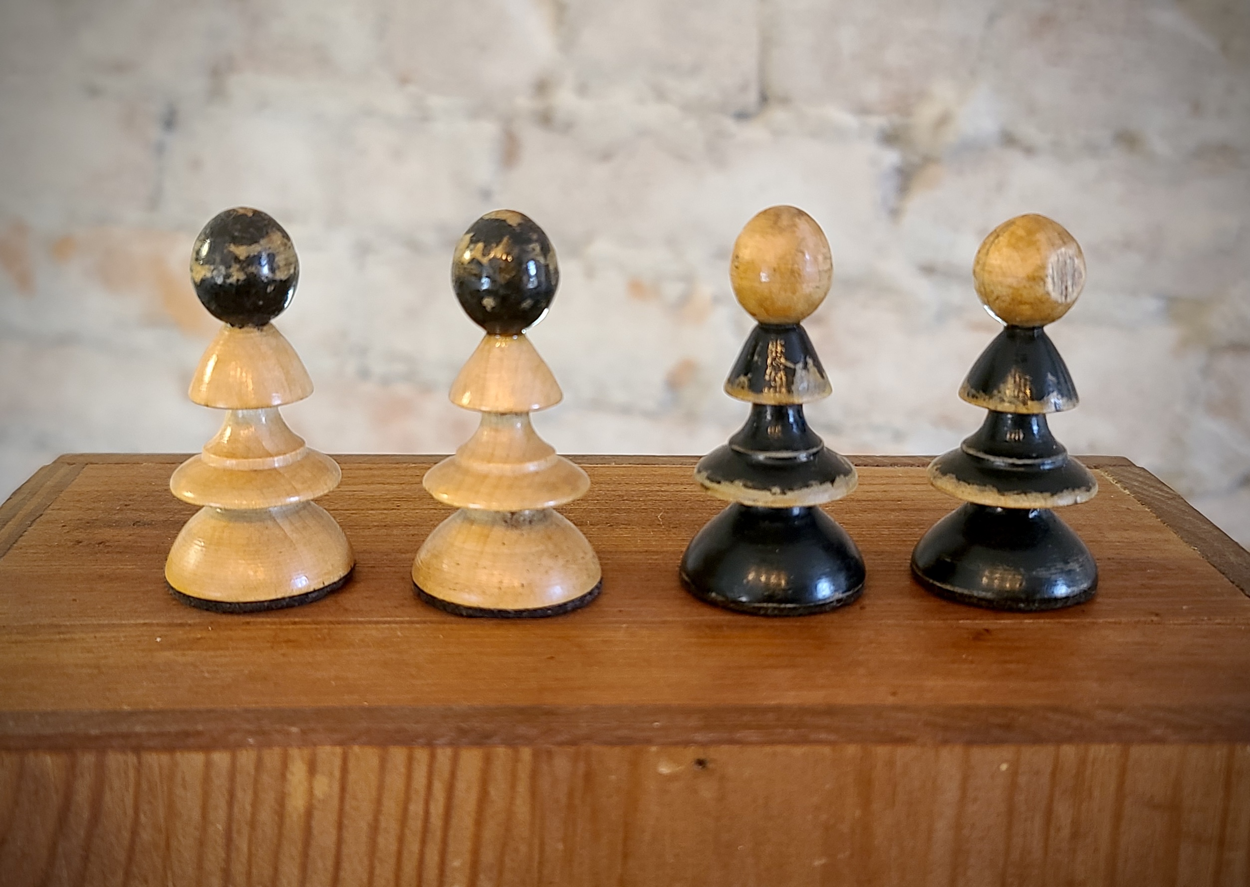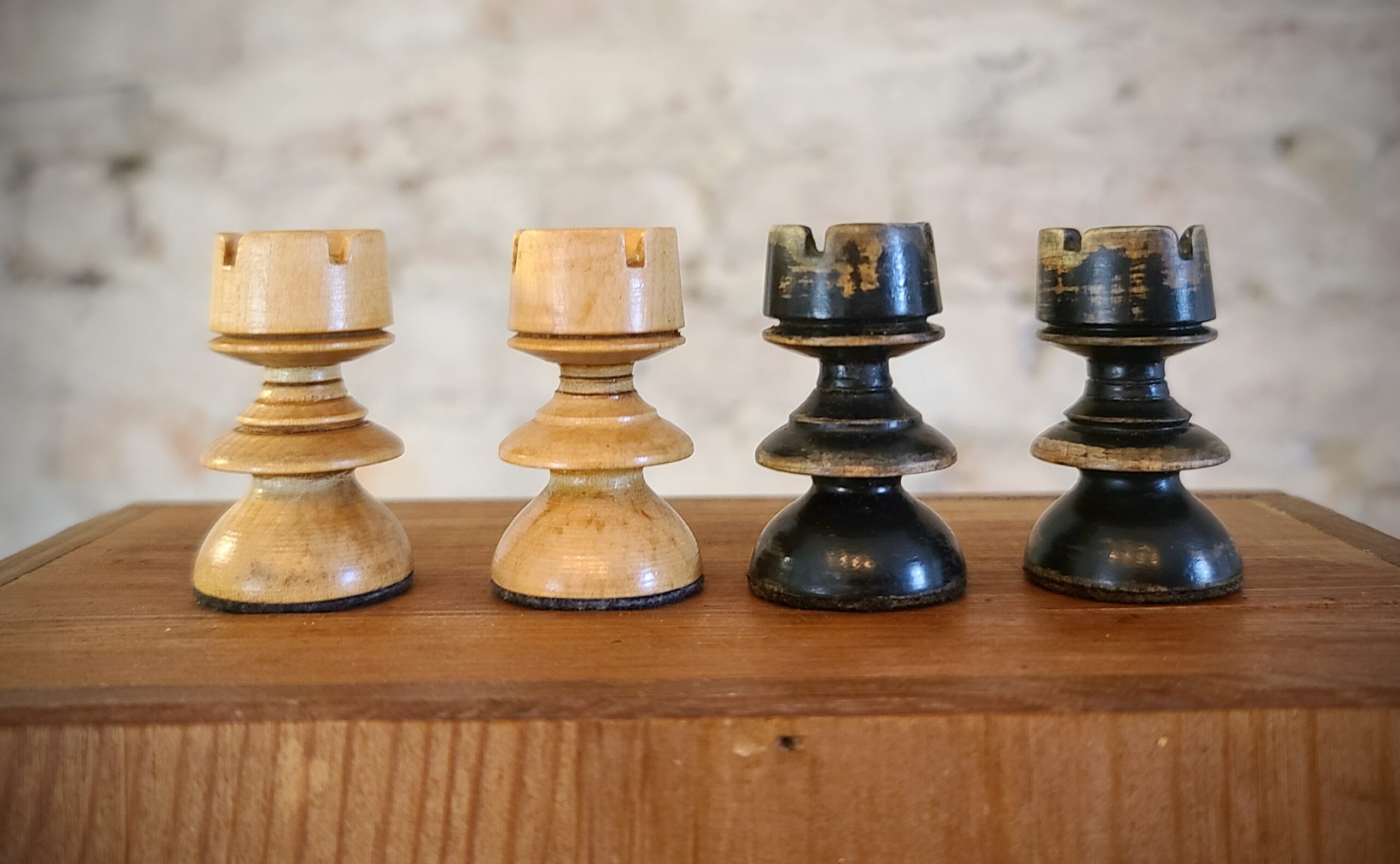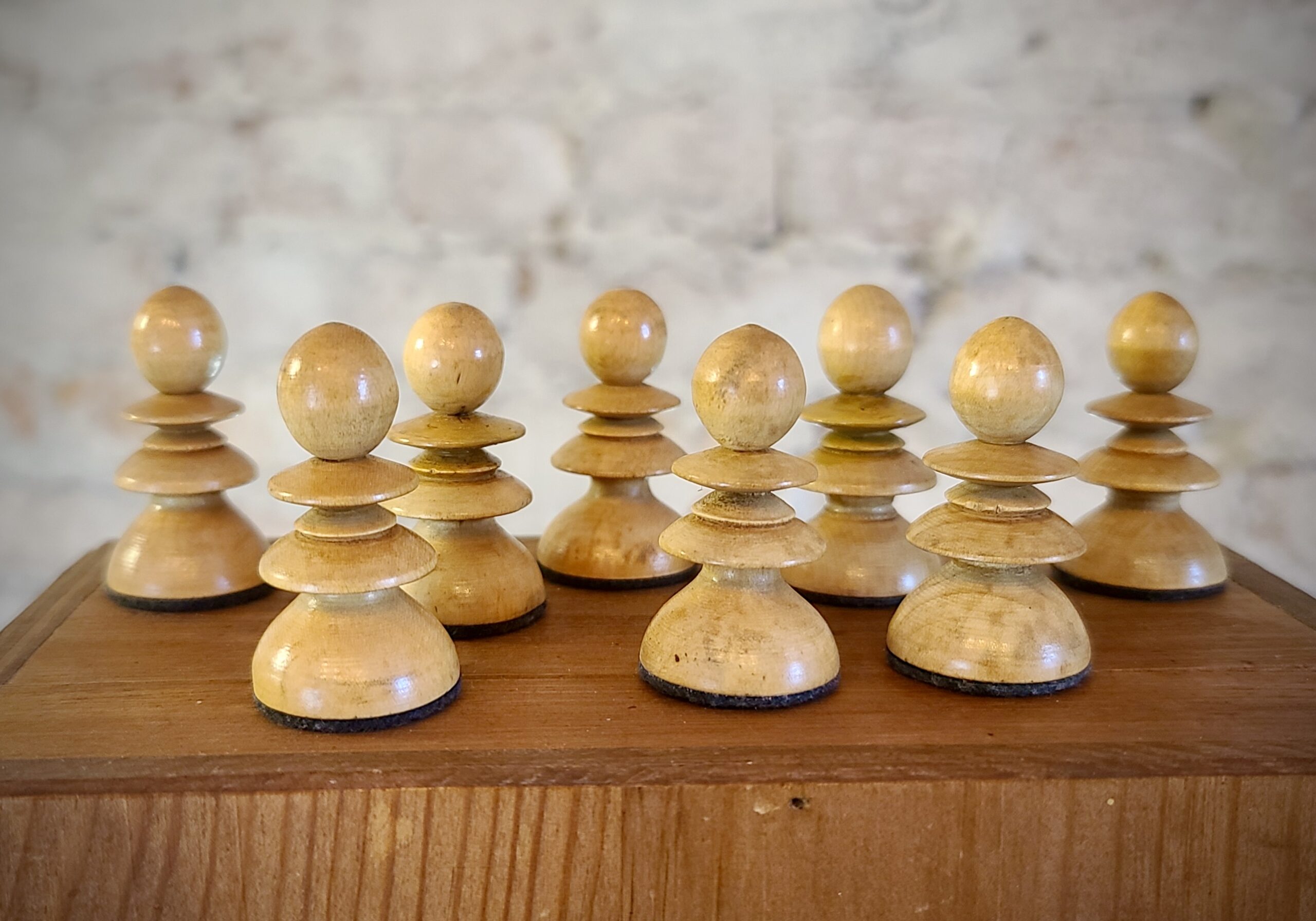The original pieces, as purchased, had a condition that the late Nicholas Lanier (chess-museum.com) called a “bubbled” effect, due to “trapped dirt” (I call this ‘finger-slime’) in the porous grain of the wood. This slime has been carefully removed and the raw wood reworked and artistically restored to a decidedly more uniform, antiqued condition. During this restoration process, weight was also added to make the pieces more enjoyable to play with over the board – a mission I believe I have accomplished, all round!