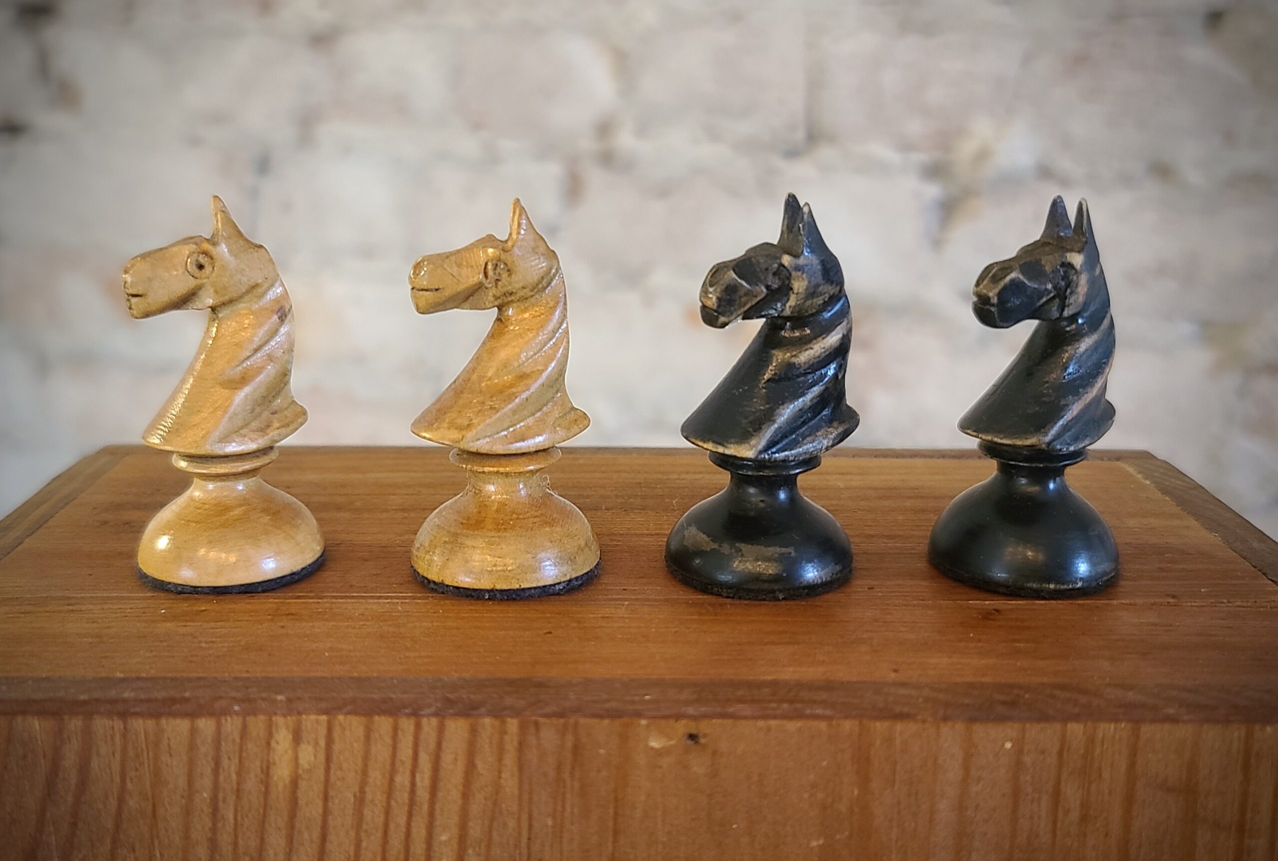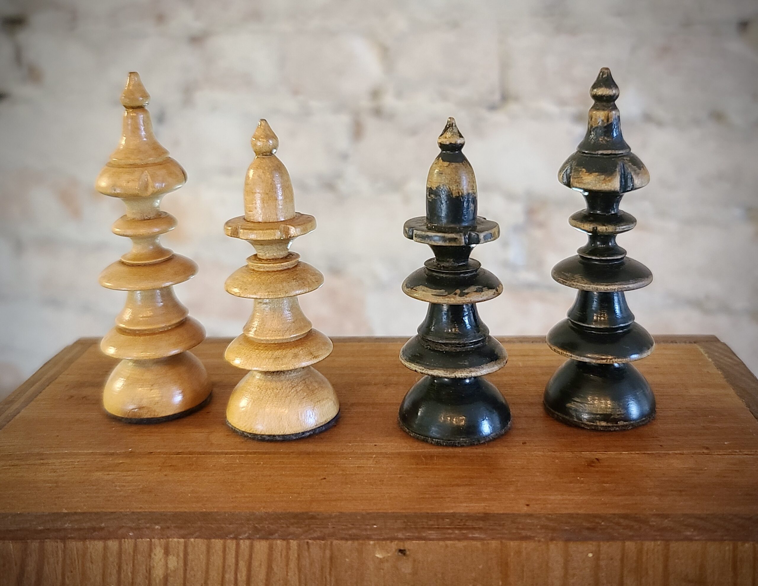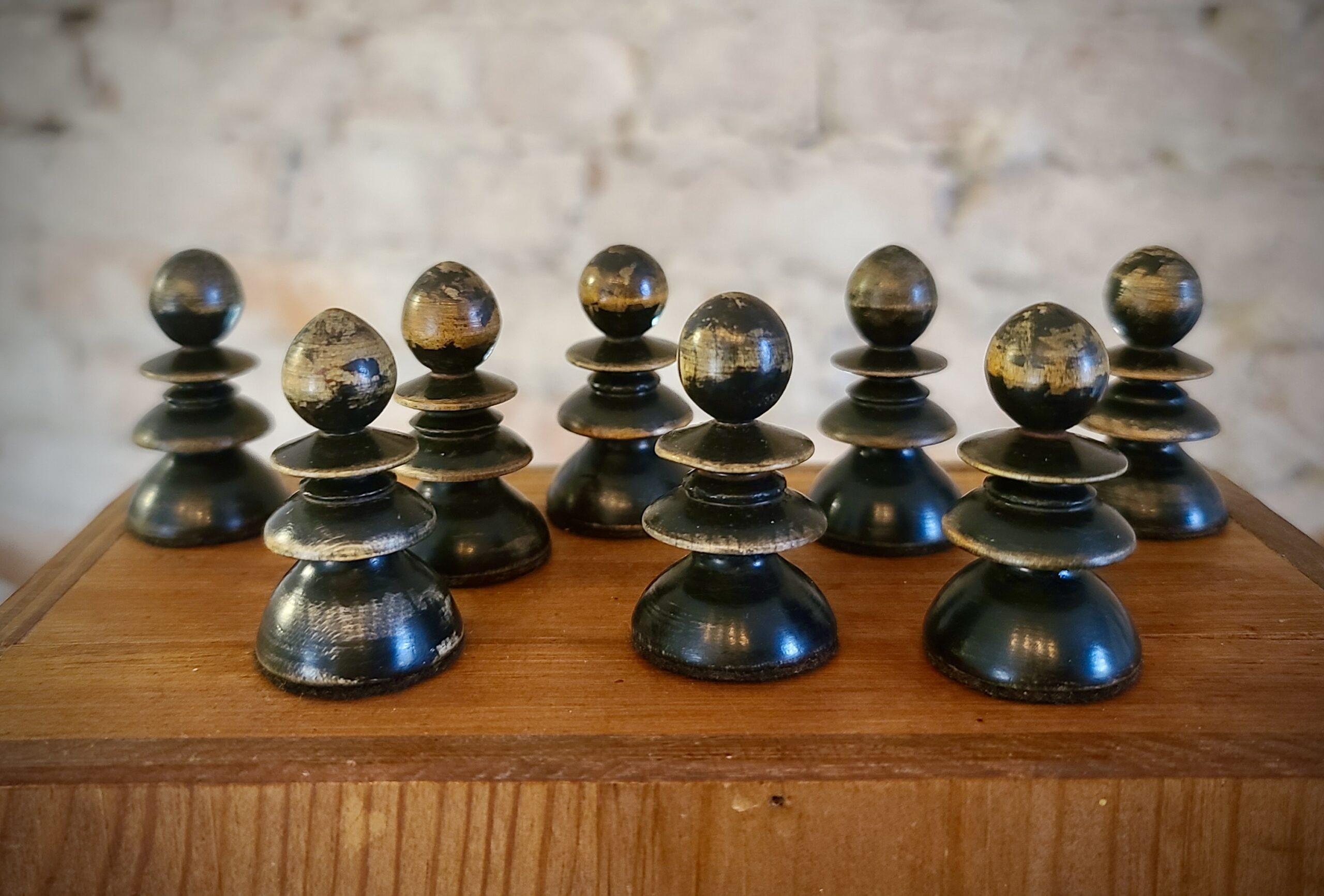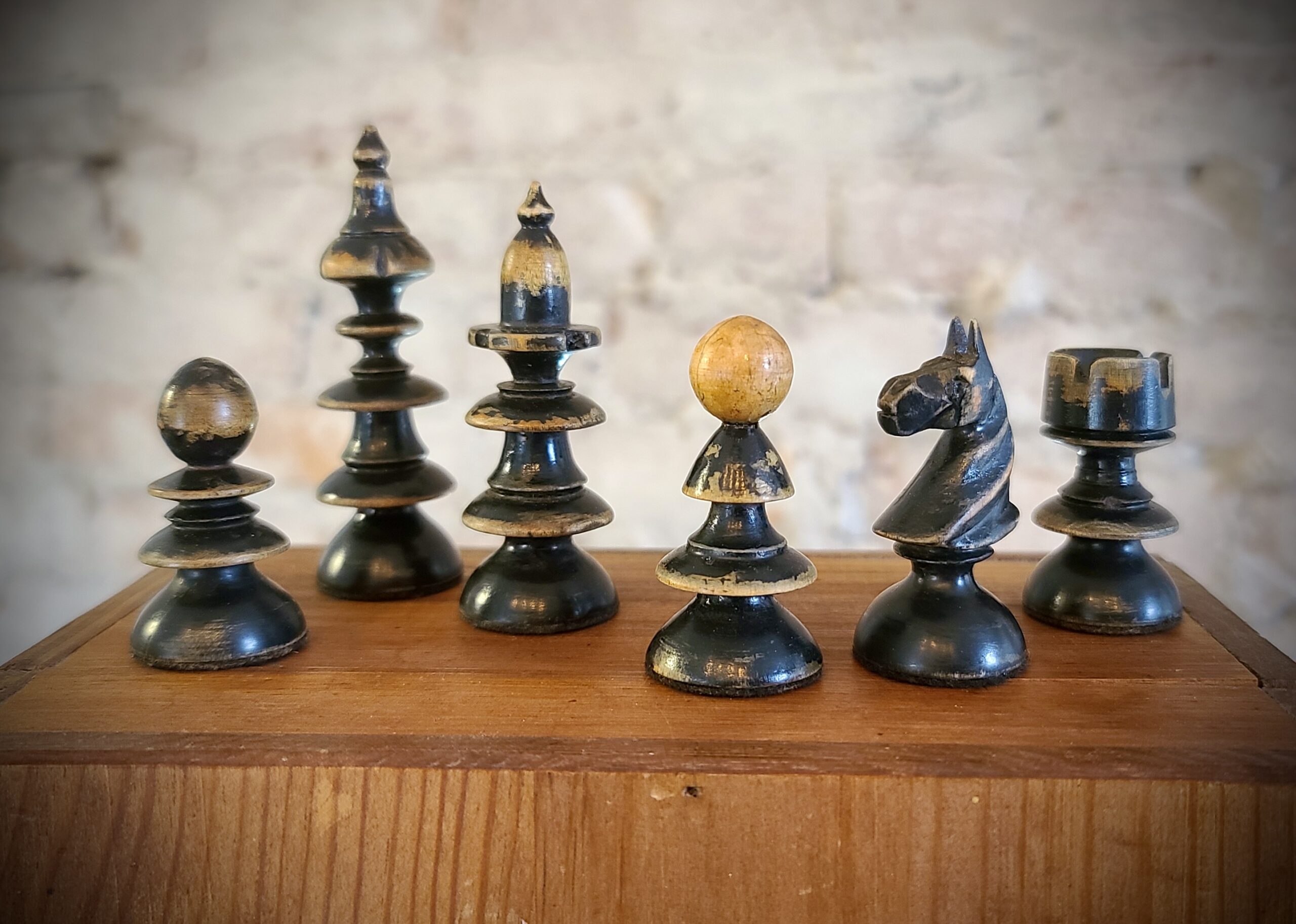 The original pieces, as purchased, had a condition that the late Nicholas Lanier (chess-museum.com) called a “bubbled” effect, due to “trapped dirt” (I call this ‘finger-slime’) in the porous grain of the wood. This slime has been carefully removed and the raw wood reworked and artistically restored to a decidedly more uniform, antiqued condition. During this restoration process, weight was also added to make the pieces more enjoyable to play with over the board – a mission I believe I have accomplished, all round!
