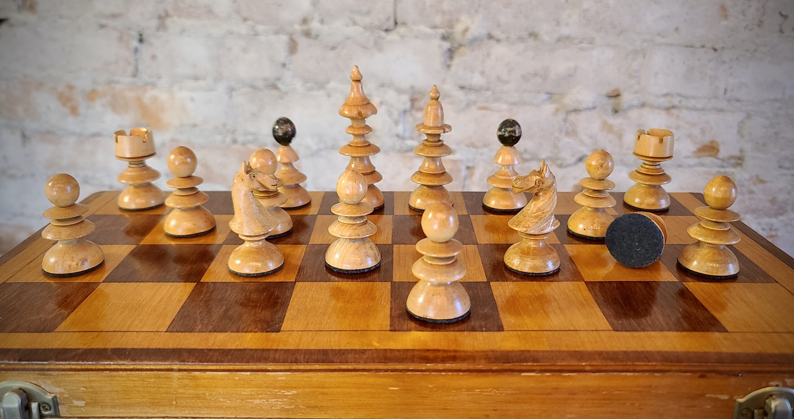 Stabulum Victores (‘Champions of the Dorm’); Soviet ‘Averbakh Style’ Egg-Bishop Chess set, c.1950s