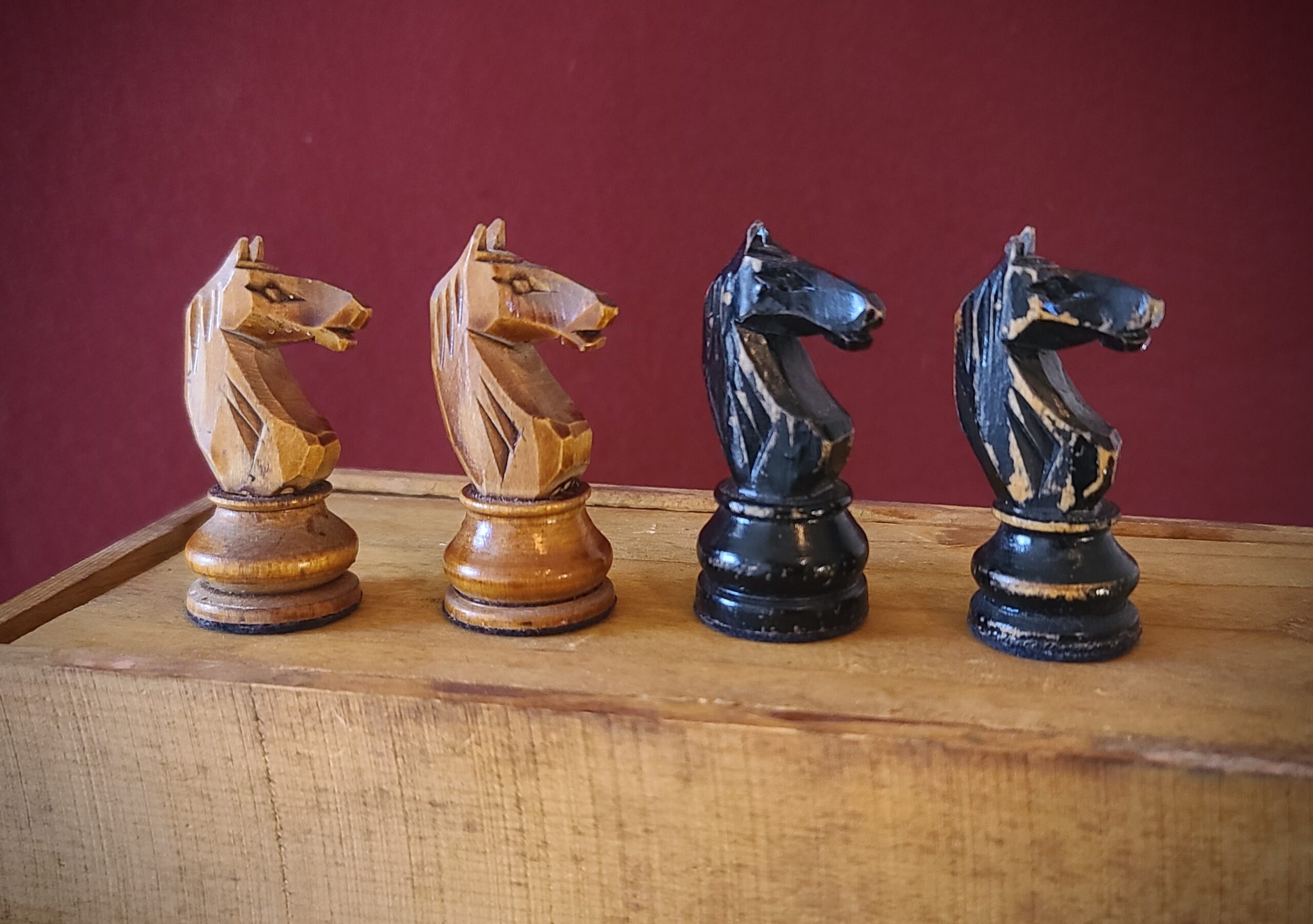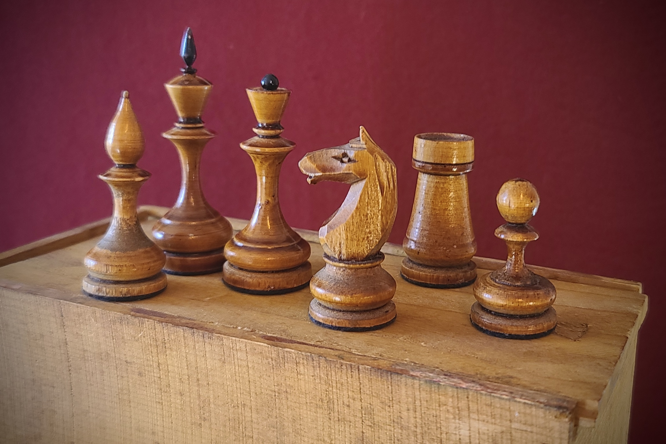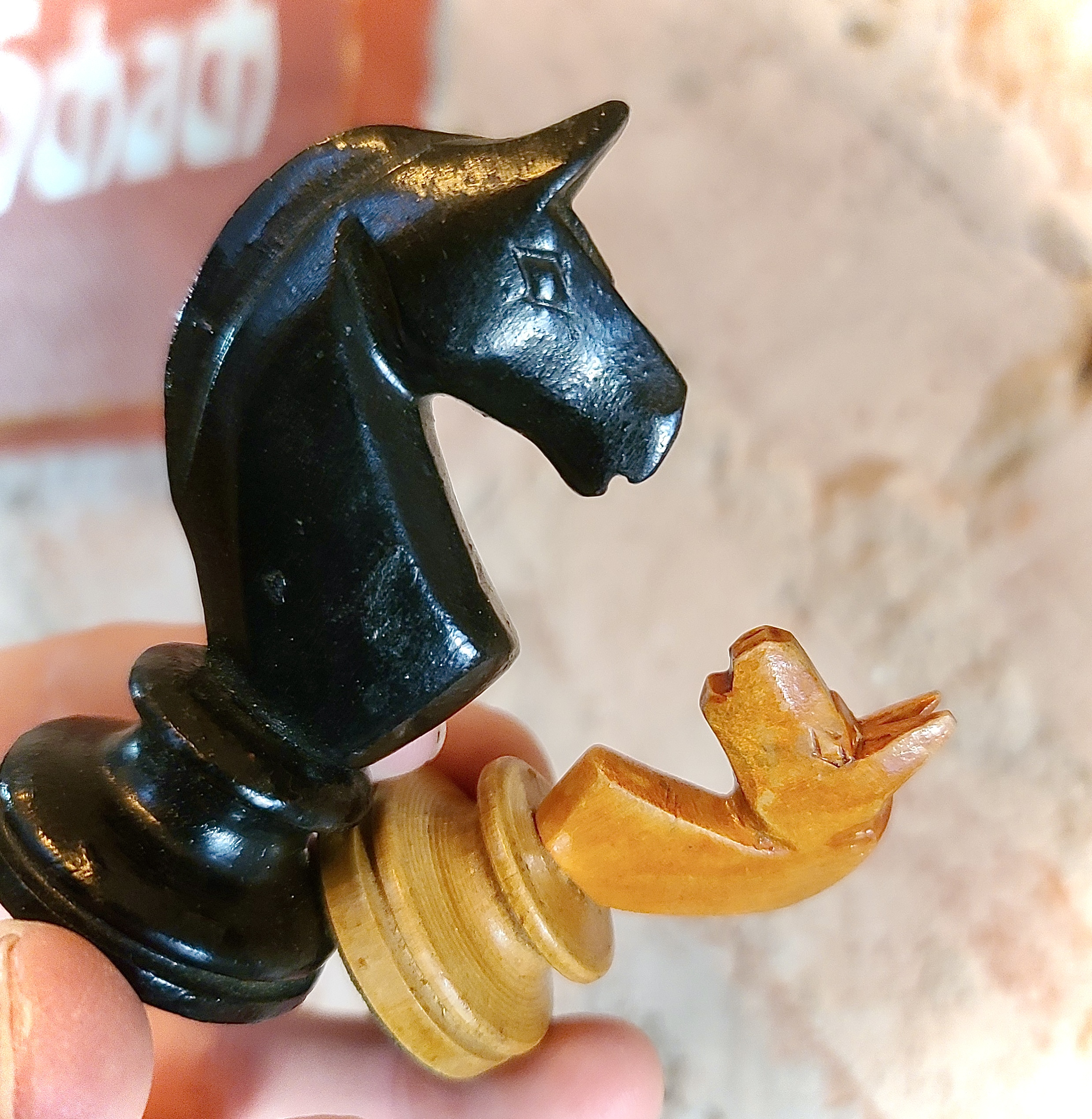 An unspeakably rare and unusual Soviet pattern, in that, the hand-carved upper torso of the knight actually resembles the head of a horse (shocking!) rather than the more familiar abstract and Brutalist forms favoured by the U.S.S.R.’s Ministry of Sports and Culture. At the time of writing, the manufactory where these medium-sized, Voronezh-style playing pieces were made is unclear, but the distinct diamond-shaped eyes of the knights are reminiscent of the Soviet “Egyptian” patterns produced by the Khalturin Artel during 40’s and 50’s (see last photo) – hence, the playful Latin moniker. Should any more info come to light you’ll read it here, as I update the archives on a regular basis.
