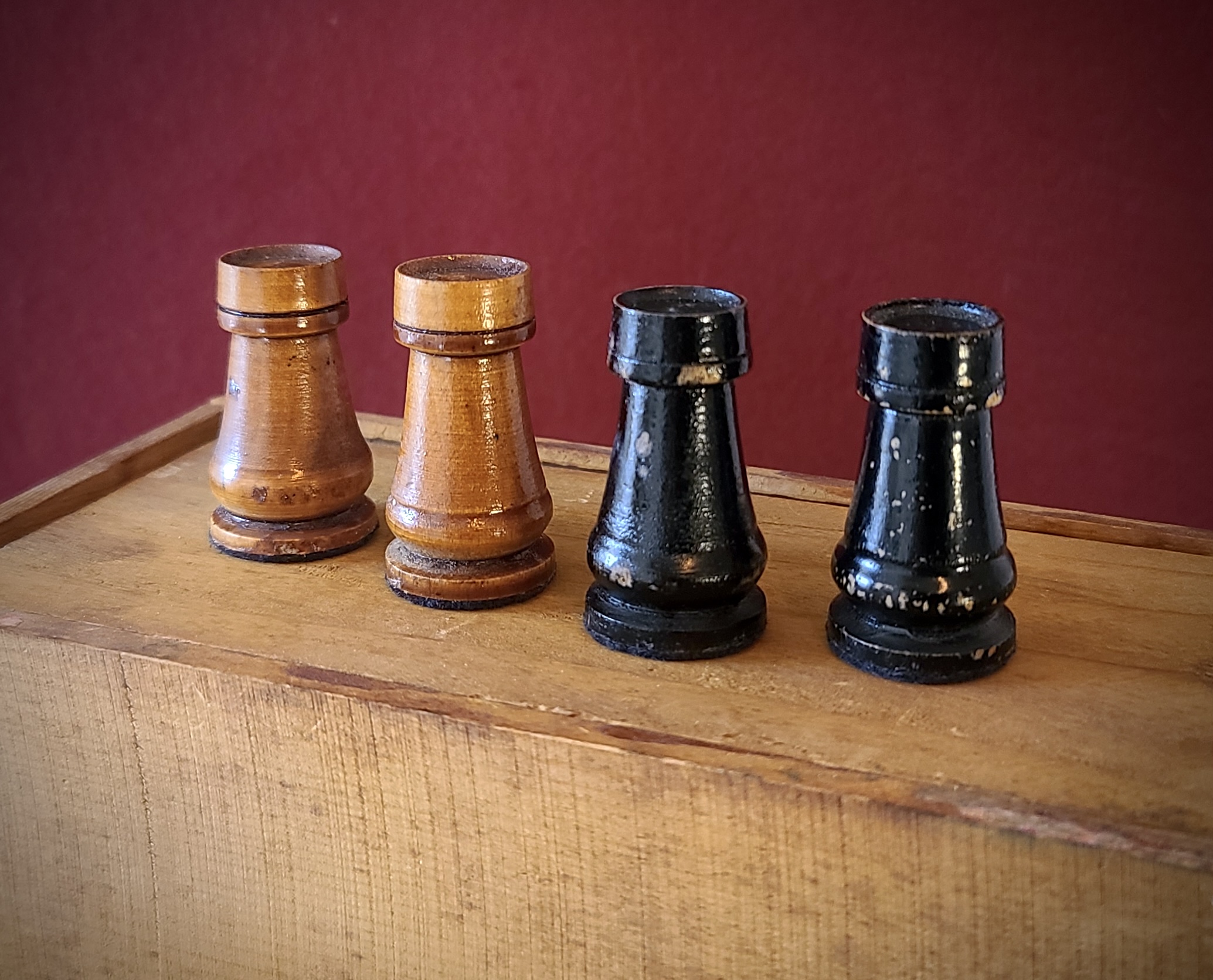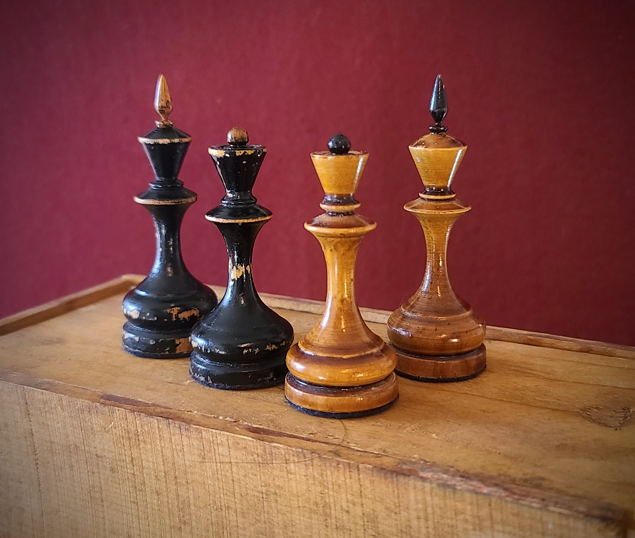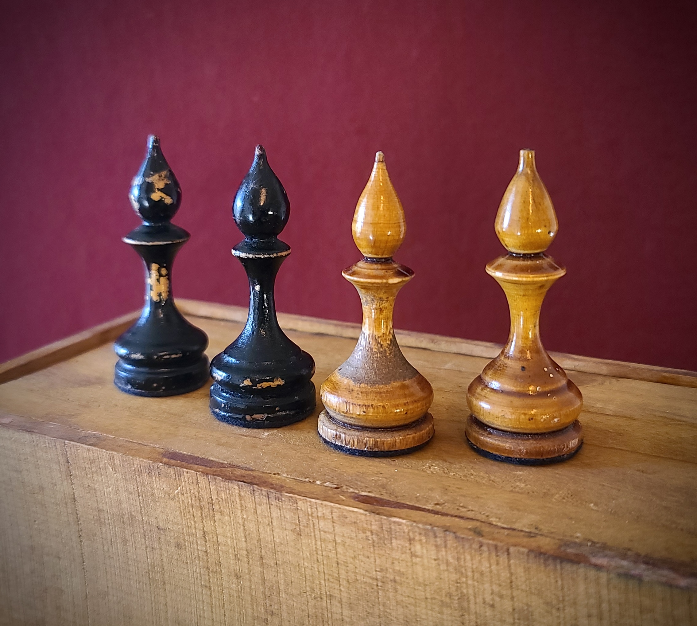 The original patina has a distressed state of drop-dead gorgeousness about it, and for the most part, has been left untouched. The original surviving finials were cast from a hard plastic, possibly carbolite, solid black vs. white. One set was missing, the one black king finial was damaged, therefore I decided to replicate the original design in wood* and match them to the sumptuous patina lending the set a more complete and aged feel as a whole. A few ugly chips have been repaired around the bases and the original, tatty dark blue cloth pads (with several missing) have been replaced with deep blue felt.