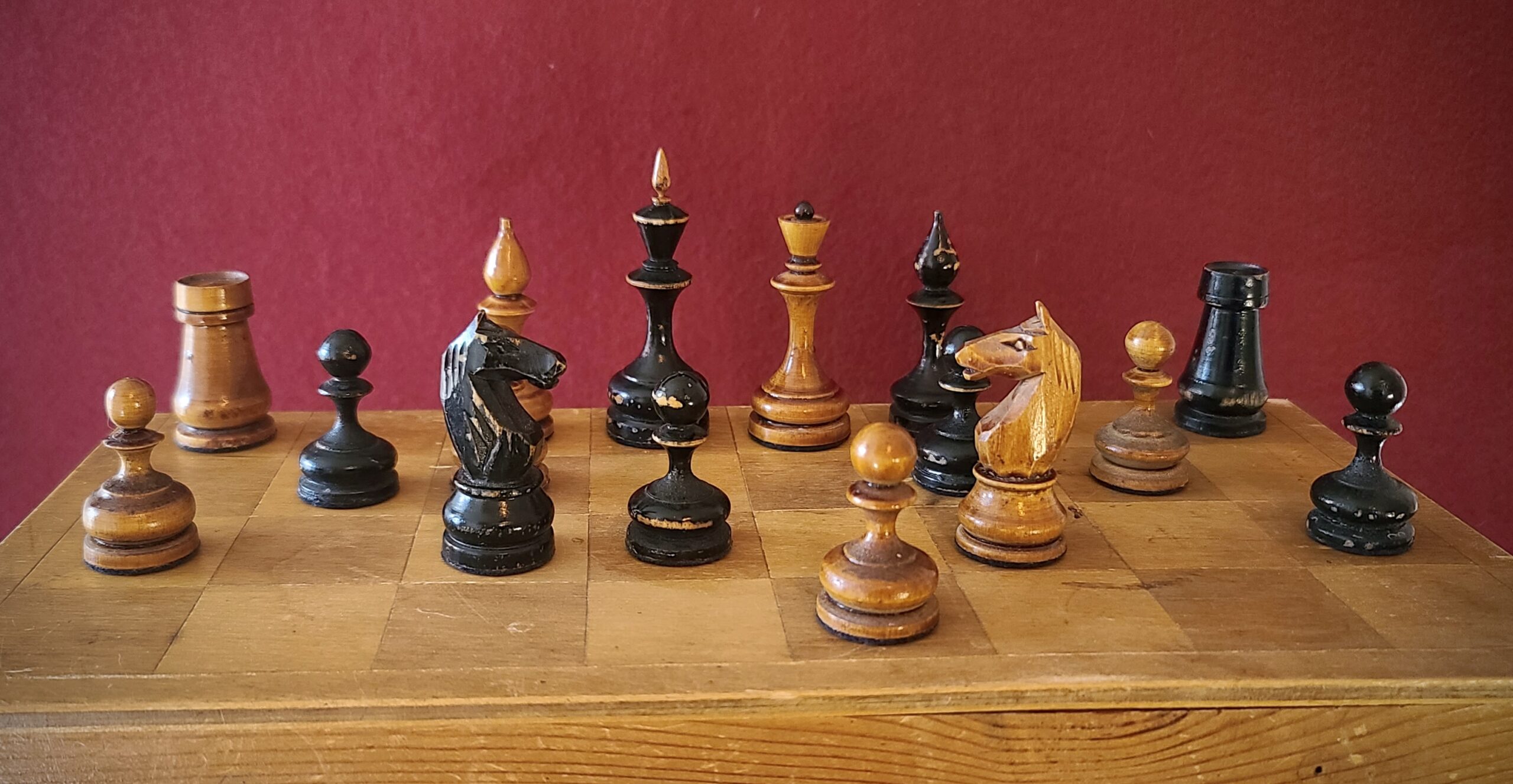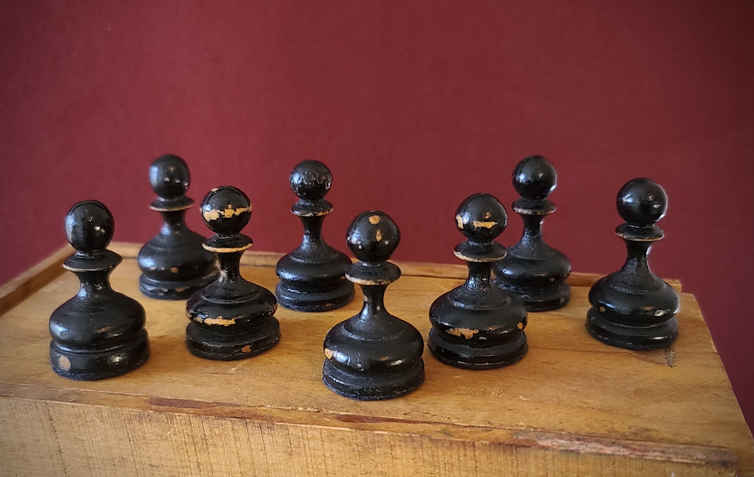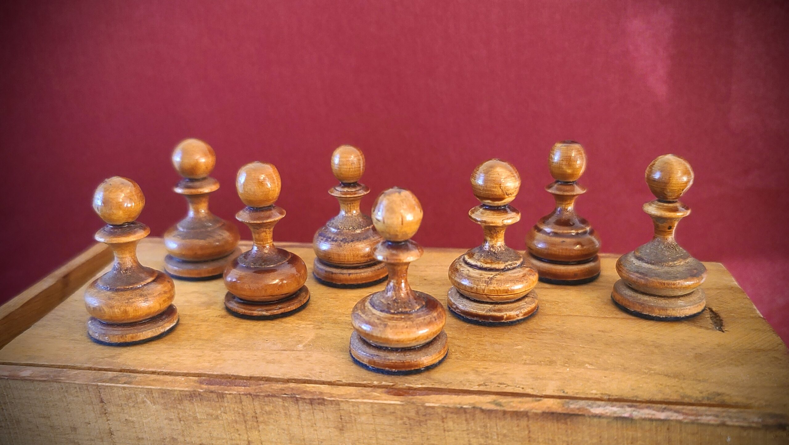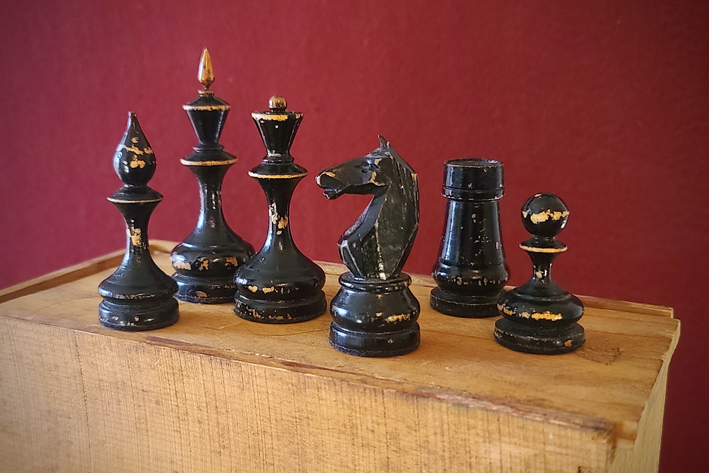 The original patina has a distressed state of drop-dead gorgeousness about it, and for the most part, has been left untouched. The original surviving finials were cast from a hard plastic, possibly carbolite, solid black vs. white. One set was missing, the one black king finial was damaged, therefore I decided to replicate the original design in wood* and match them to the sumptuous patina lending the set a more complete and aged feel as a whole. A few ugly chips have been repaired around the bases and the original, tatty dark blue cloth pads (with several missing) have been replaced with deep blue felt.