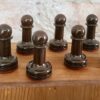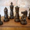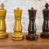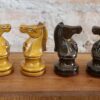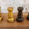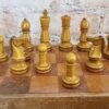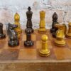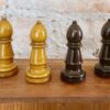 The original pieces were cast in carbolite (a hardier form of bakelite) in traditional white vs. black which were hollow and lightly weighted with discs. Over the years these weights had become loose and rattled around inside of the pieces, so these were removed entirely and replaced with lead caulking, filling the entire cavity to give the pieces a very solid feel over the board and eliminating the ‘plasticky’ clacking sound of hollow pieces.